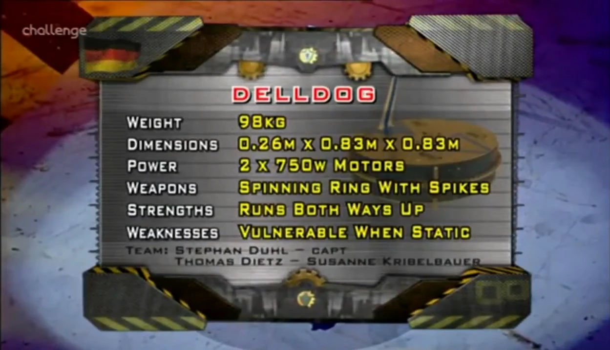 Delldog was a German robot which competed in German Robot Wars and the UK vs Germany Special, also broadcast as part of Series 6 of the UK Robot Wars.