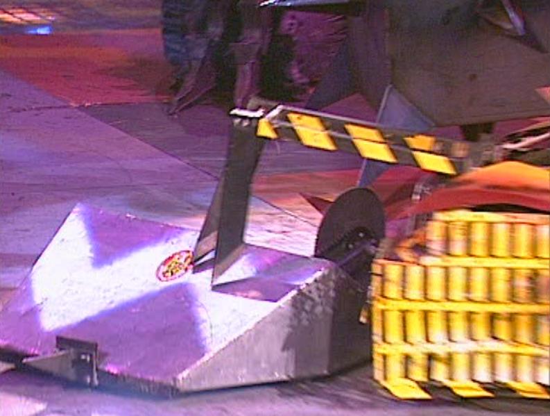 Demolition Demon continued its streak of placing first, winning the Skittles event by a clear margin, knocking down twenty barrels. Despite this success, the House Robots used Demolition Demon as a target to demonstrate their power, and Sir Killalot picked it up, holding it in place for Matilda to put a large scratch on Demolition Demon, using her chainsaw.