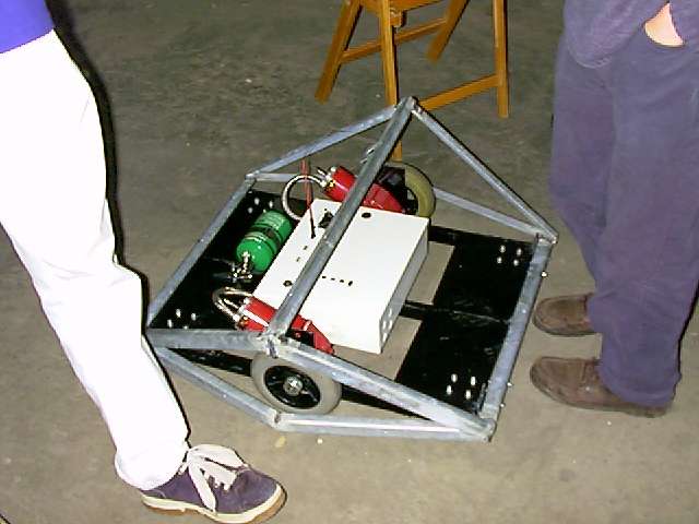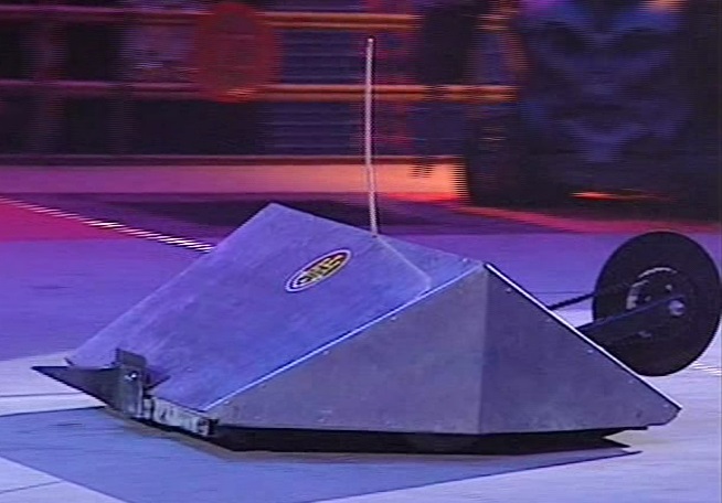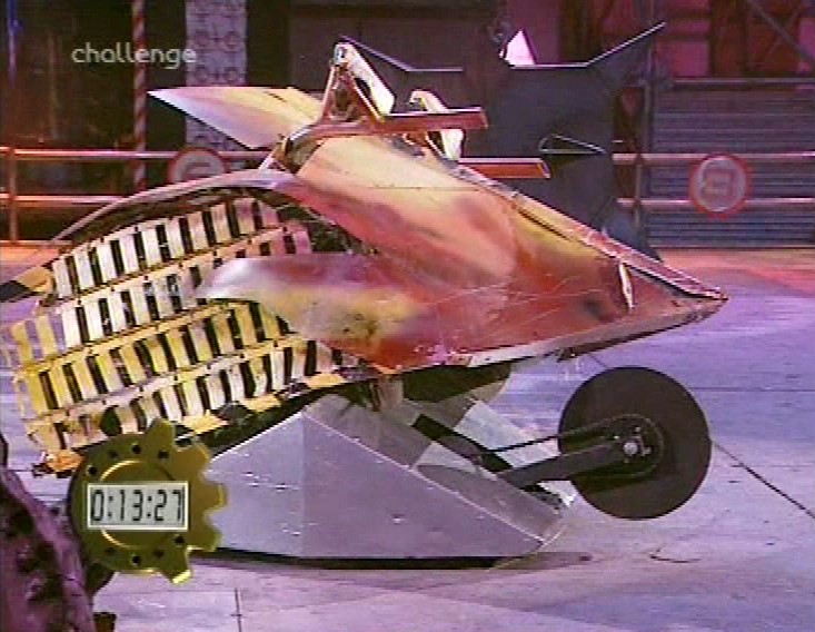 The original machine was a double-sided wedge-shaped robot, armoured in galvanised materials, with a top speed of 8mph. Its weapon was a rear circular grinding disc, powered by what the show described as a 22 horsepower motor (although this was likely a typo that would read 2.2 horsepower), and a static spike on the front. The grinding saw could be replaced with a long spike, which the team used in the Skittles Trial to help them knock barrels. Three 12V lead acid batteries powered the machine, and its 24 volt electric wheelchair motors were donated by Dorset County Council. All the essential components were kept in a small box for protection.