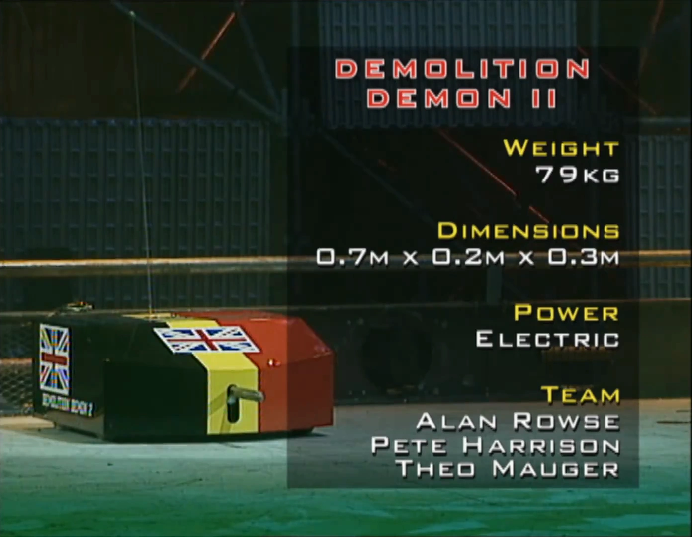 Demolition Demon 2 was a box-shaped robot, armed with spikes at the front and back. Its colour scheme used black, yellow and red stripes, resembling the Belgian flag, although the robot brandished several Union Jacks. It was built to be internally stronger than the previous version, and was over 12kg heavier than the original, but had a high ground clearance and was slow and not very manoeuvrable during its only appearance.