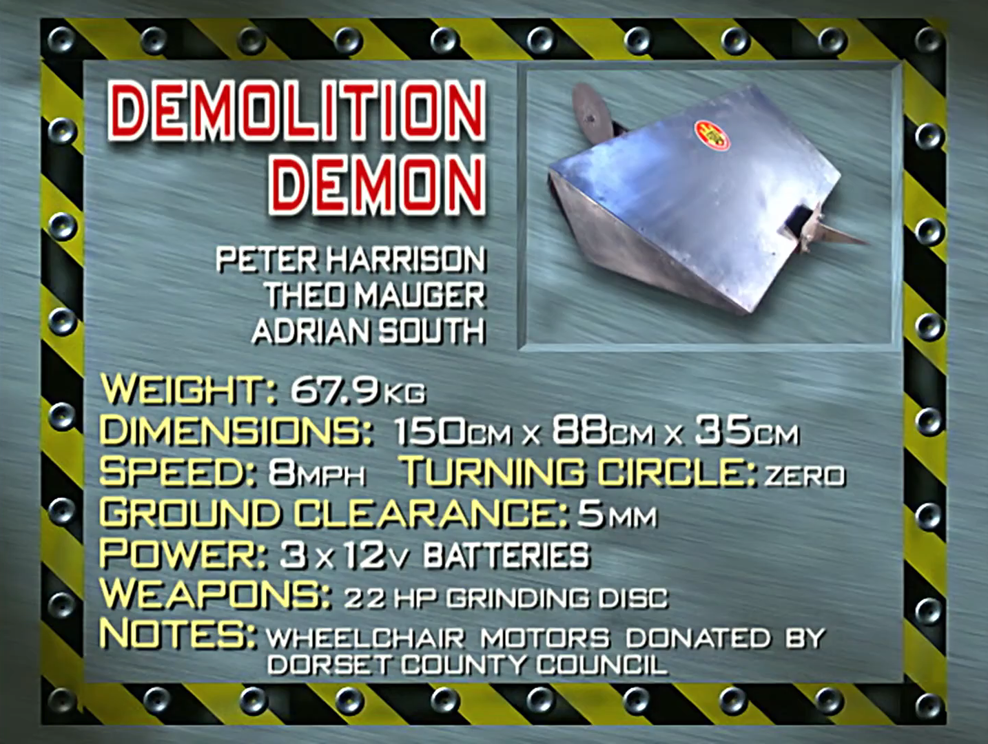 Demolition Demon appeared at the Series 2 rehearsals with no weaponry or armour, despite this it was still successful in qualifying for the series.