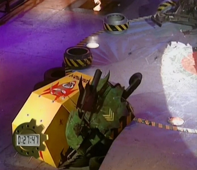 In the King of the Castle trial, Demon again tested its pushing power as it was immediately caught by Dead Metal, taking punishment from the circular saw. The House Robots nudged it towards the edge although Demon withstood the pressure, before Sergeant Bash came in with a charge and took both itself and Demon off the ring, giving it a time of 27.47 seconds.