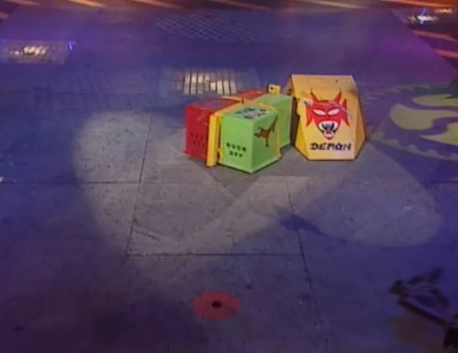 Demon came up against The Mule in the Arena Semi-Final. It first withstood early aggression and lifting from Roger Plant's machine, which then avoided the pit at one point during a rear thrust from Demon, bringing its spikes into play. The Mule shoved Demon towards the PPZ, until Demon fought back by turning on the spot, poking the tip of its wedge under The Mule and shunting it into the PPZ itself. Despite this, Sir Killalot came in and attacked Demon as it had become immobilised. As the fight came to a close, Sir Killalot tried to drive up the front of Demon. The fight went to the Judges, but they ruled in favour of The Mule.