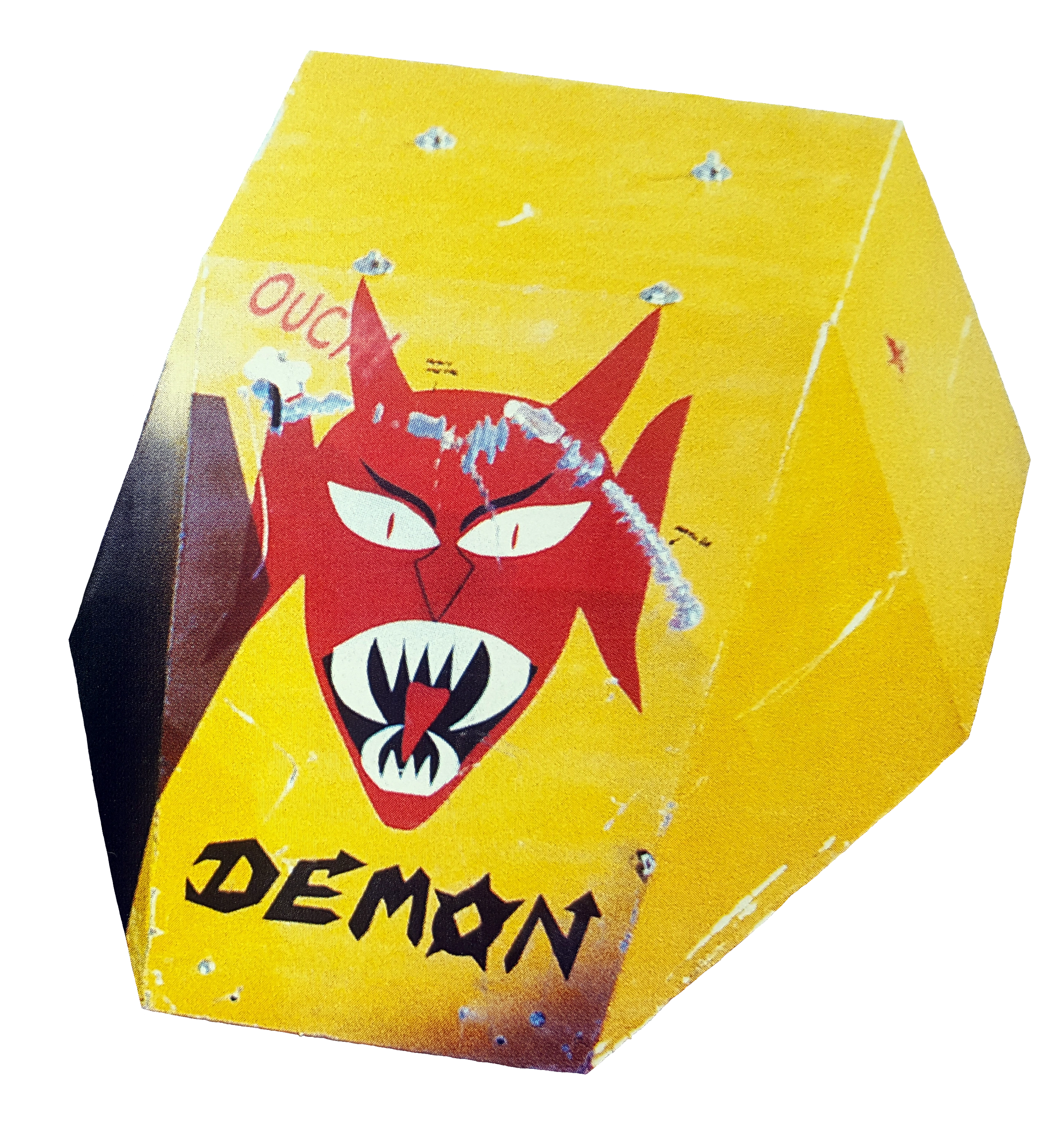 Demon was a very basic box-shaped robot, painted yellow. Built with an aluminium and mild steel casing, it featured a front shunting wedge that bore a red devil's face, a pair of steel ramming spikes at the rear and a very low top speed of only 2mph. The low speed was because the motors came from an indoor wheelchair, which were less powerful than outdoor wheelchair motors. The robot's name was taken from the now-defunct RC production line Demon RC Power Products, owned and operated by Nick Adams (until his passing). The company's logo which consisted of a running, pitchfork-wielding imp was printed on both the robot's side panels.