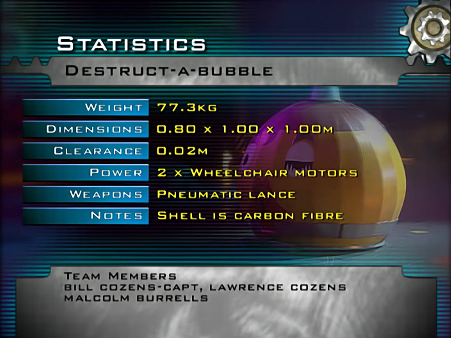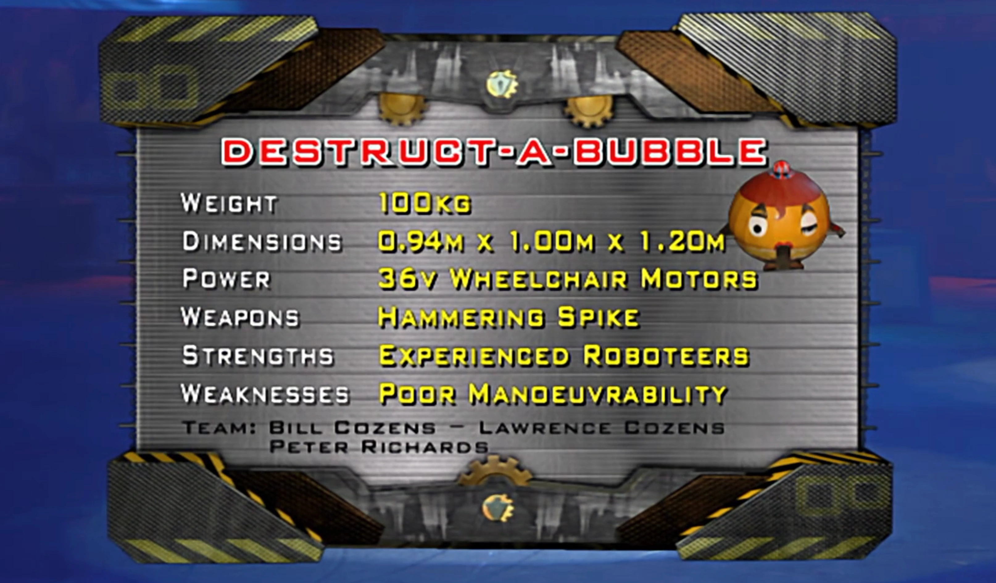 Destruct-A-Bubble was the creation of the Cozens family from Essex. The team captain was Bill Cozens, who designed and built the robot and he was consistency joined by his son, Lawrence Cozens, who was Destruct-A-Bubble's driver. In Series 4, the pair were joined by Malcolm Burrells who operated the weapons, but Peter Richards took his place in the role for Series 5. Of the members, Lawrence was the only one who did not speak on camera.