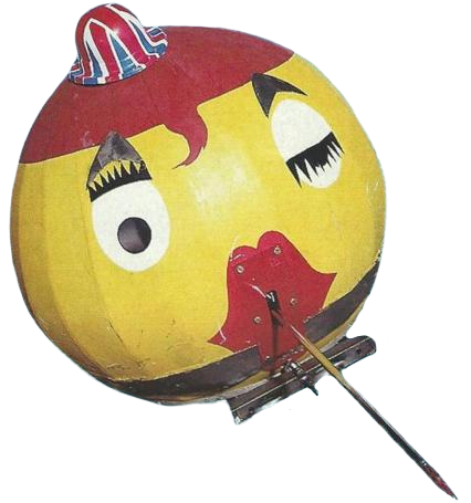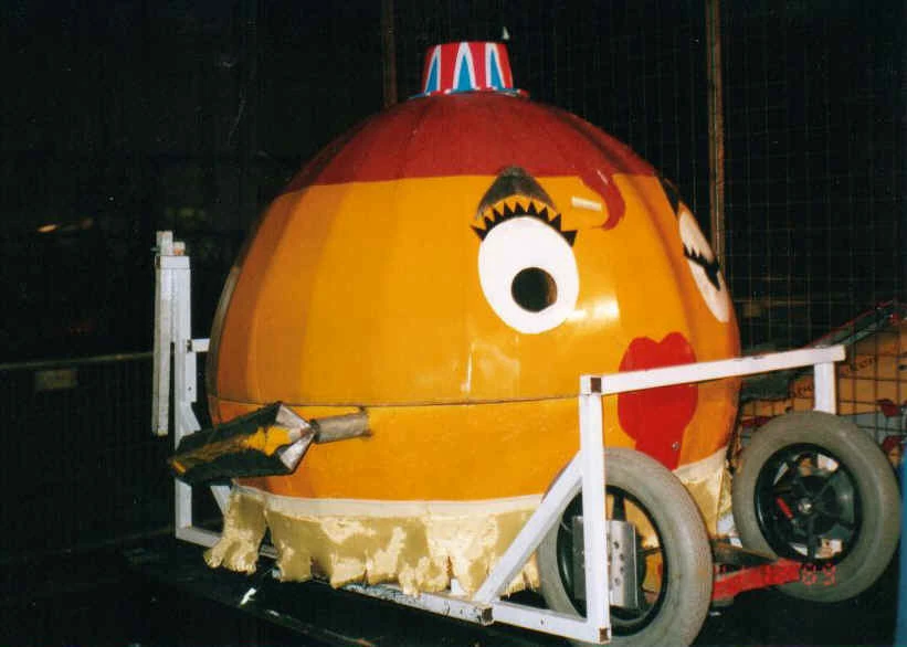Destruct-A-Bubble was a large sphere-shaped robot made of carbon fibre and Kevlar with a flat bottom that ran on two-wheel drive. It was painted yellow with red hair and a cartoon style face complete with titanium eyebrows and featured a small decorative bowler hat on the top. Occasionally, a 'hairnet' to snag spinning weapons would also be implemented. Some parts came from a tractor, the robot had a steel chassis and it was bottom heavy which made it difficult to flip over. In Series 4, it had a two foot long pneumatic lance for its weapon, which was nicknamed 'the mother-in-law's tongue').