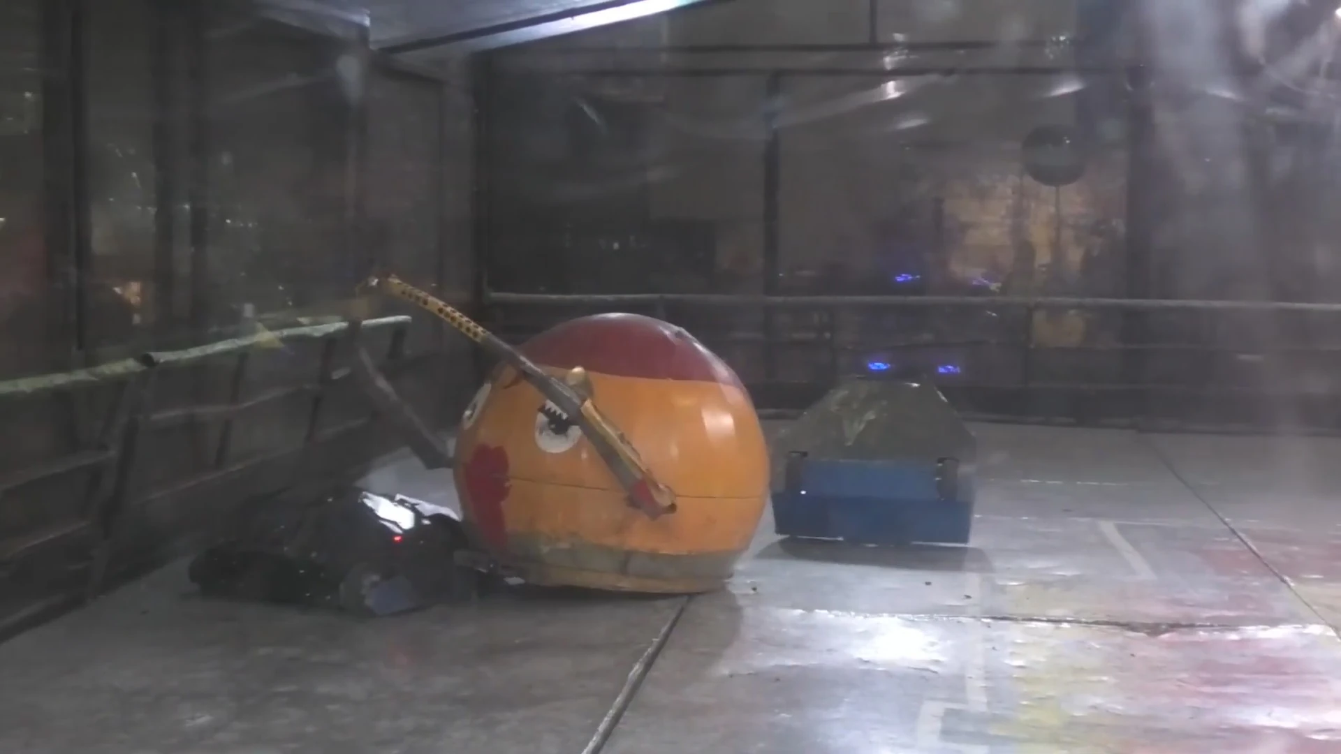 - "I am not too sure if the damage was caused by the pneumatic spike or it was self-inflicted by trying to ram it. Looking at the position of the holes, probably a bit of both, still a good humoured battle"