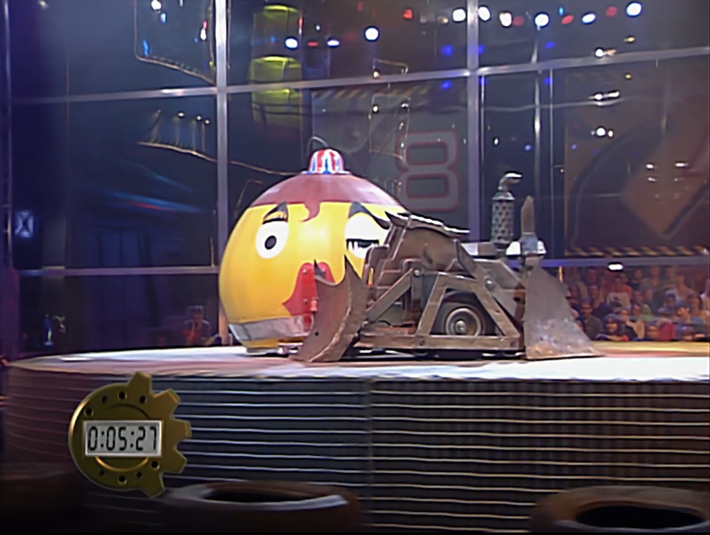 Destruct-A-Bubble first attempted to qualify for Series 4 by participating in the Robot Mayhem live shows. Attending on 30 July 2000, it fought a tentative head-to-head against Team EyeEye walker Miss Struts. Destruct-A-Bubble initially struggled during the opening moments, which saw both competitors collide head-on. While untroubled by Miss Struts' lifter, it struggled to push its opponent from the front or side. However, an impromptu intervention saw an unidentified House Robot push Destruct-A-Bubble into Miss Struts; both competitors were directed towards the Pit, where a control error from Miss Struts ultimately sent it tumbling 'head first'.[1] Destruct-A-Bubble was declared the winner and qualified for The Fourth Wars as a result. It would be similarly successful in qualifying for The Fifth Wars the following year, ironically being responsible for Team EyeEye not qualifying for the second series in a row after fighting Arnold A. Terminegger to a stalemate.