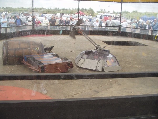 Destructosaur in battle with Terrorhurtz and CHIP at Roaming Robots in Gaydon 2002