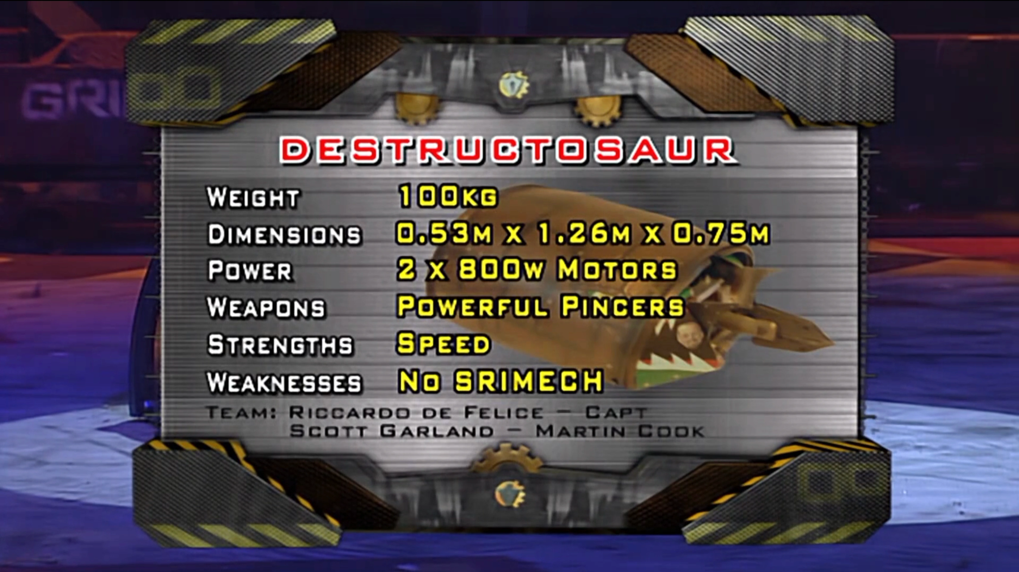 Destructosaur was a robot that only competed in Series 6 of Robot Wars. Despite the team's confidence that their weapon could destroy Chaos 2's flipper (to which George Francis admitted was a possibility), the two-time UK champion was still able to easily dispatch Destructosaur by flipping it where it did not have enough momentum to self-right despite its shape.