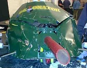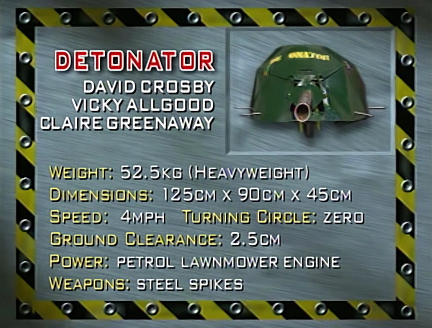 Detonator was a green dome-shaped robot armed with several steel side spikes and a long sawn-off pipe which was intended to be used as a battering ram (the robot's name was likely inspired from its shape and weapon which bore the resemblance of a standard bomb). It was one of the few robots in Series 1 to be petrol-powered, using a lawnmower engine for forward drive and a Vauxhall Cavalier starter motor for reverse drive, and had a decorative light sensor which the team described would 'confuse' opponents. With a top speed of 4mph and wheels sourced from wheelchairs and wheelbarrows, Detonator suffered from numerous manoeuvrability, control and reliability problems that hampered its progress in the Gauntlet and ultimately saw it fail to move at all during its Trial.