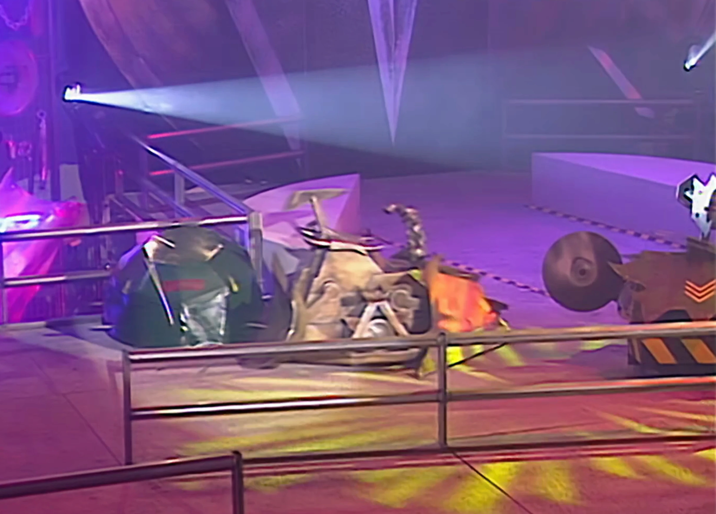 After spending a considerable amount of time stuck on the turntable, Detonator was freed by Shunt before being pushed and axed across the arena, much to David Crosby's exasperation.