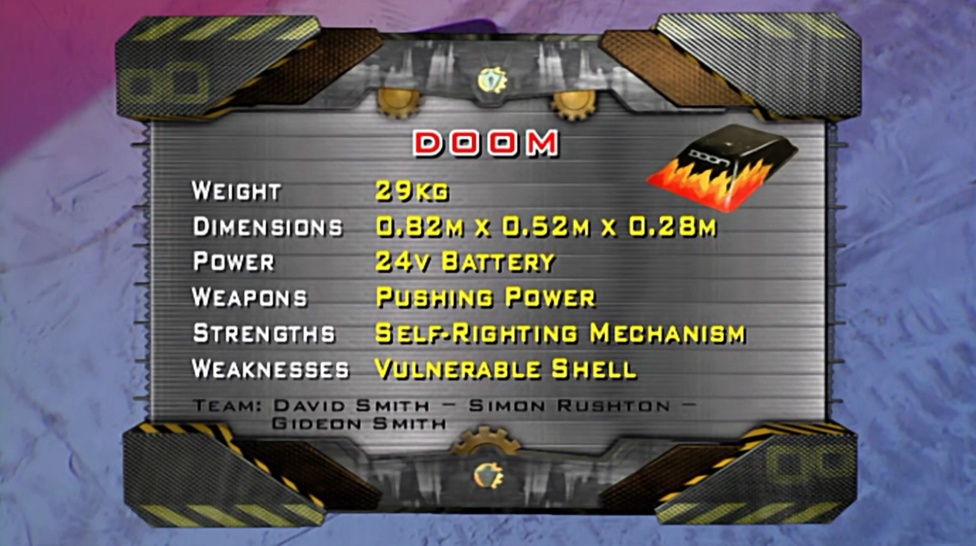 In the Extreme Series 1 Middleweight Melee, Doom was placed up against former champion Hard Cheese, another weaponless machine in Genesis, future champion Typhoon, Zap and walkerbot Mammoth.