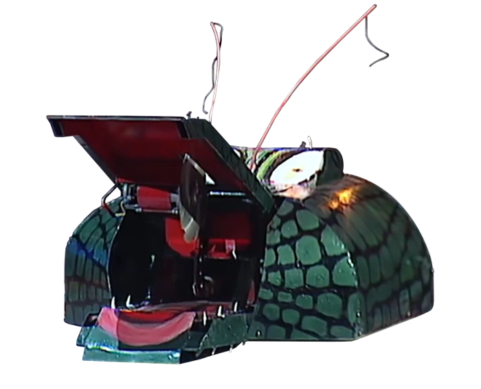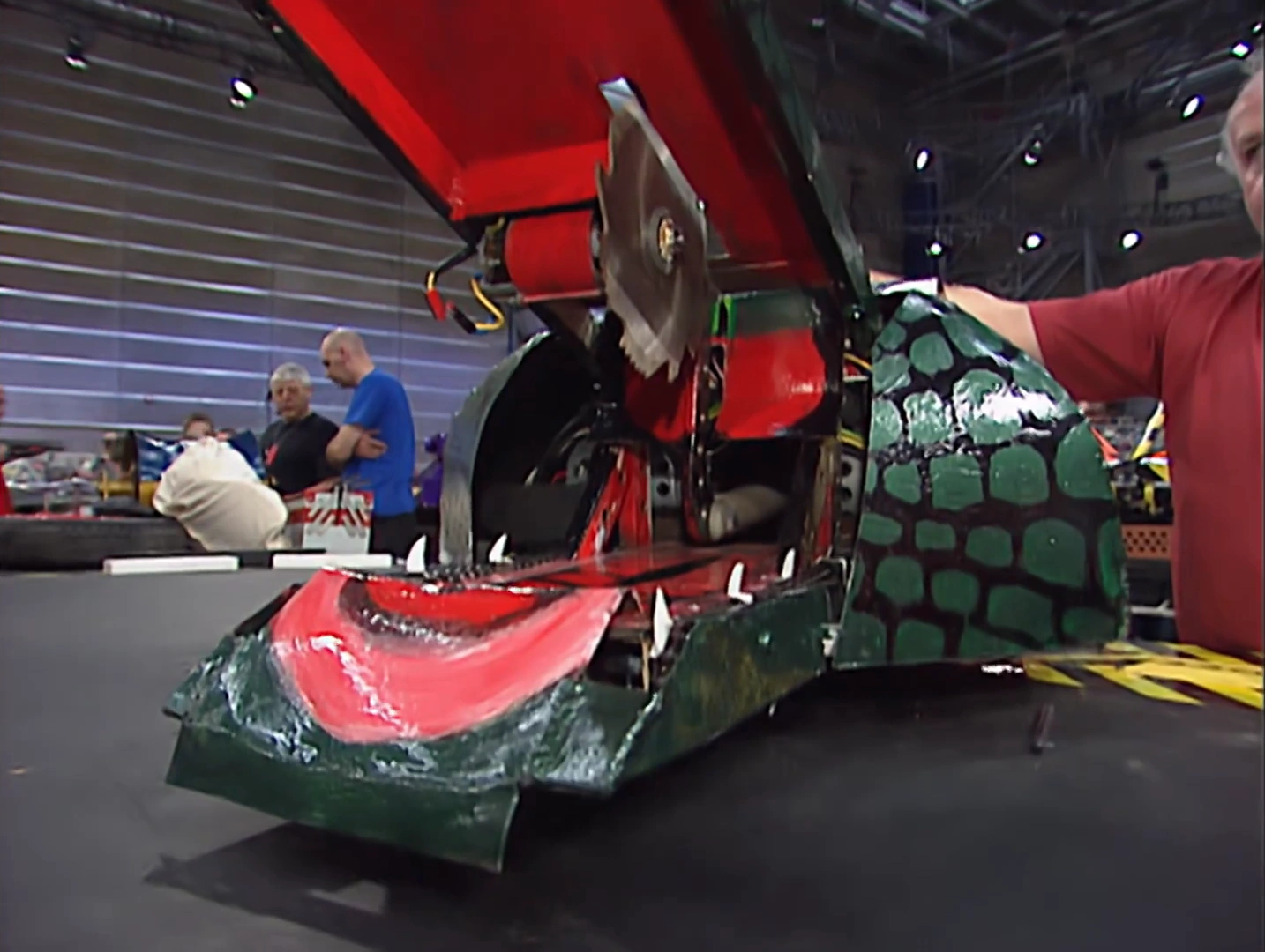 Dundee was a box wedge-shaped robot designed to resemble a crocodile, and armed with a novel and versatile set of weapons. These consisted of upper and lower crushing rams forming the crocodile's 'mouth', with sets of metal 'teeth', themselves driven on chains designed to snag and bite down on opponents. Mounted underneath the upper ram was an electric-driven cutting disc, its most damaging feature. Dundee's upper ram was also capable of acting as a lifter when lowered, with the intention of getting underneath opponents and tipping them over.