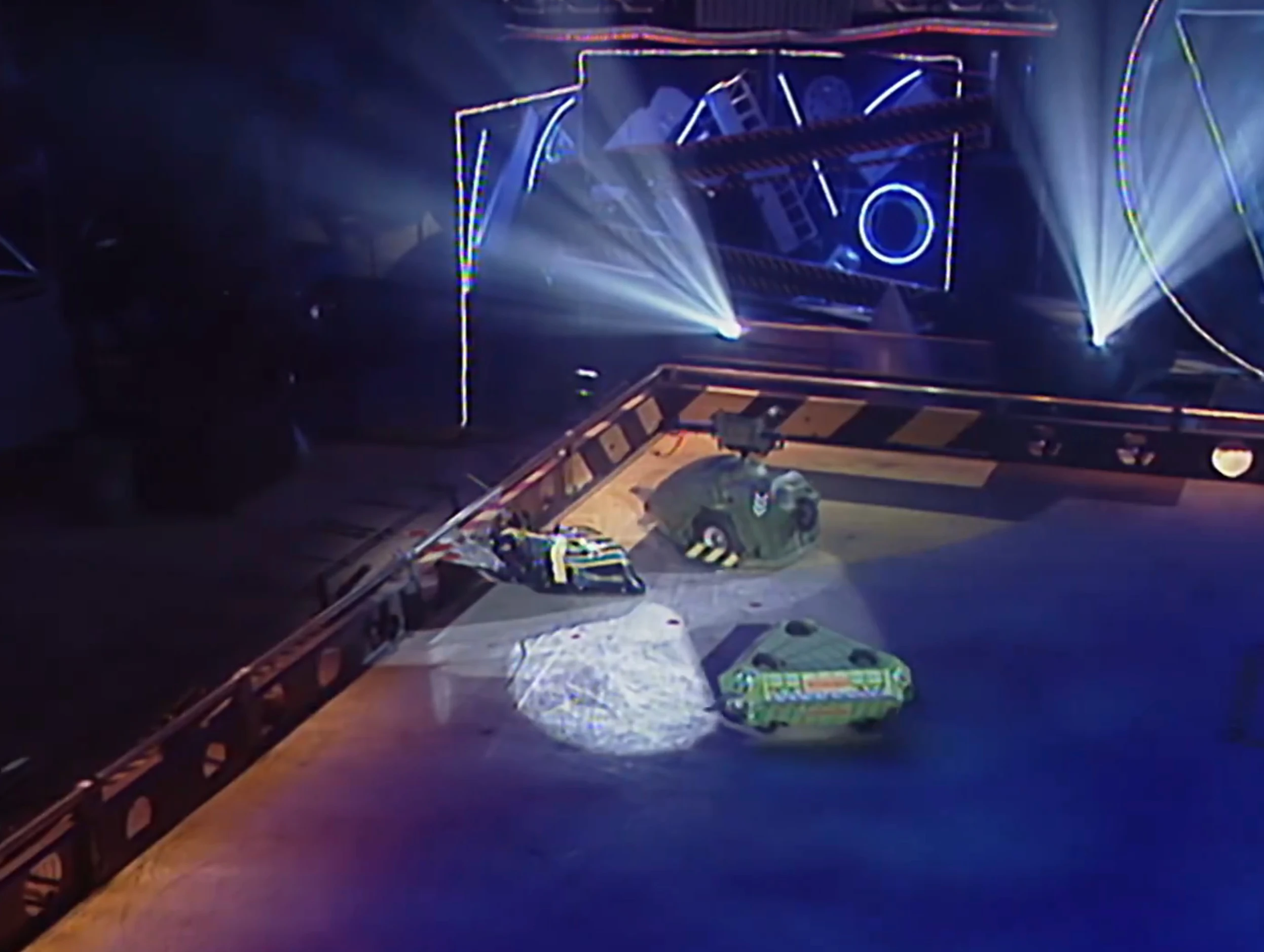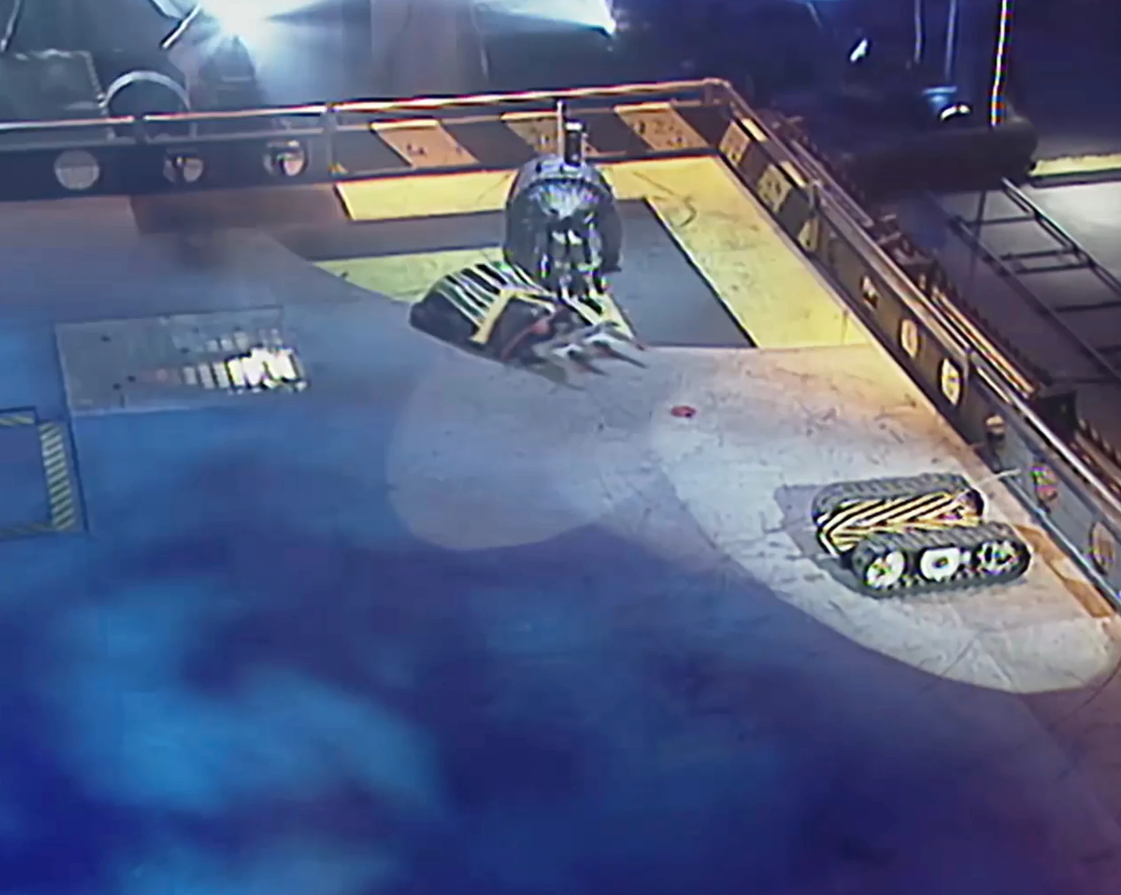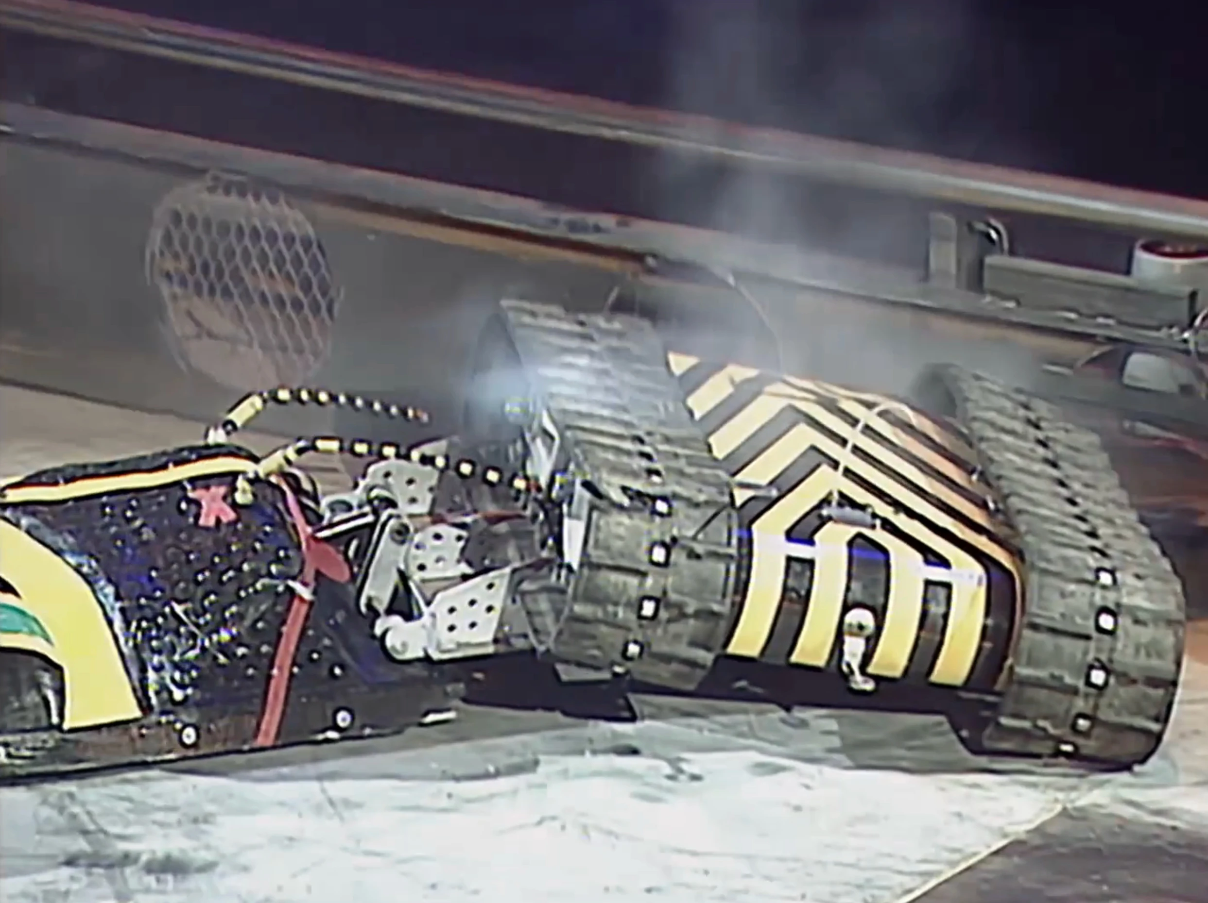 Triterobot drove away, but Evil Weevil chased after it. Evil Weevil quickly caught Triterobot, and Triterobot's high ground clearance made it easy for Evil Weevil to push, ramming it up the arena, over the Arena Spike and to Sir Killalot's CPZ. However, as Sir Killalot came over to attack Triterobot, Evil Weevil reversed, pulling Triterobot back with it. Evil Weevil reversed for another charge, but when it charged, it drove at the wrong angle, driving past Triterobot rather than getting underneath. As it did so, one of Triterobot's spikes became caught in the side of Evil Weevil, and as Evil Weevil reversed, it dragged Triterobot back with it. As Evil Weevil drove back and forth to try and get free, Triterobot activated its smokescreen.
