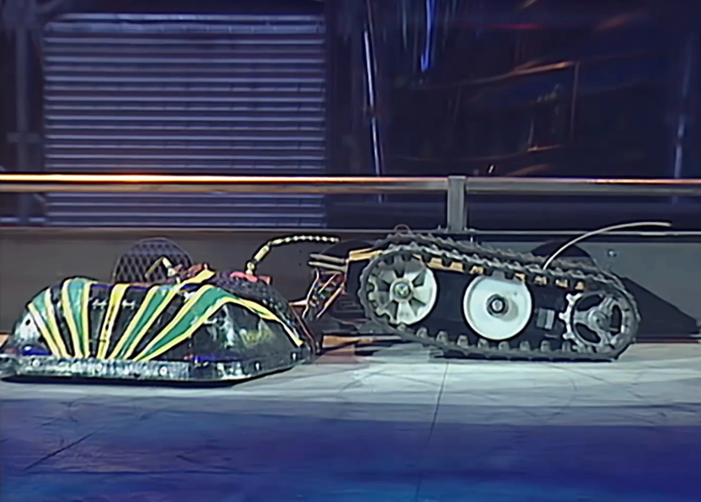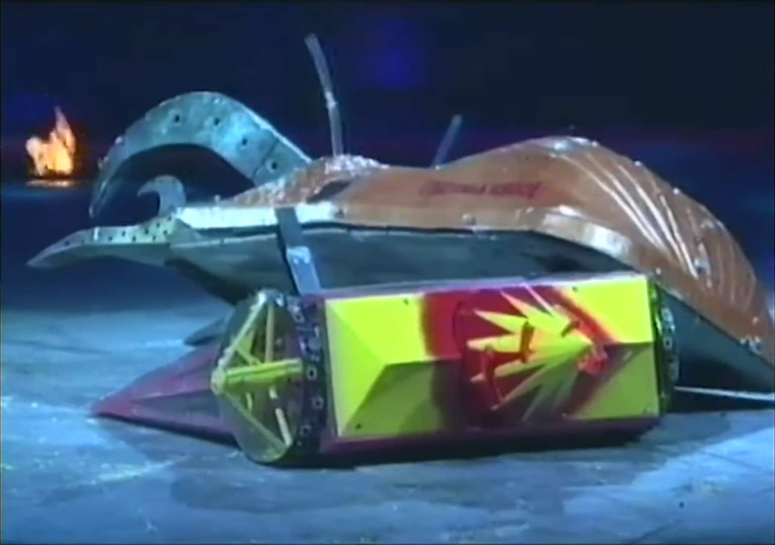 Unable to get free of Triterobot's spike, Evil Weevil appeared to stop, but after pulling Triterobot to the side of the arena, Evil Weevil was able to reverse free, helped by Triterobot spinning. Triterobot drove down the arena, and Evil Weevil charged after it, but turned incorrectly, not getting under its opponent. Evil Weevil drove up the arena for another charge, but as it tried to get under Triterobot, Triterobot turned away. Evil Weevil kept pushing, trying to get under it, and Triterobot drove up the side of Evil Weevil.