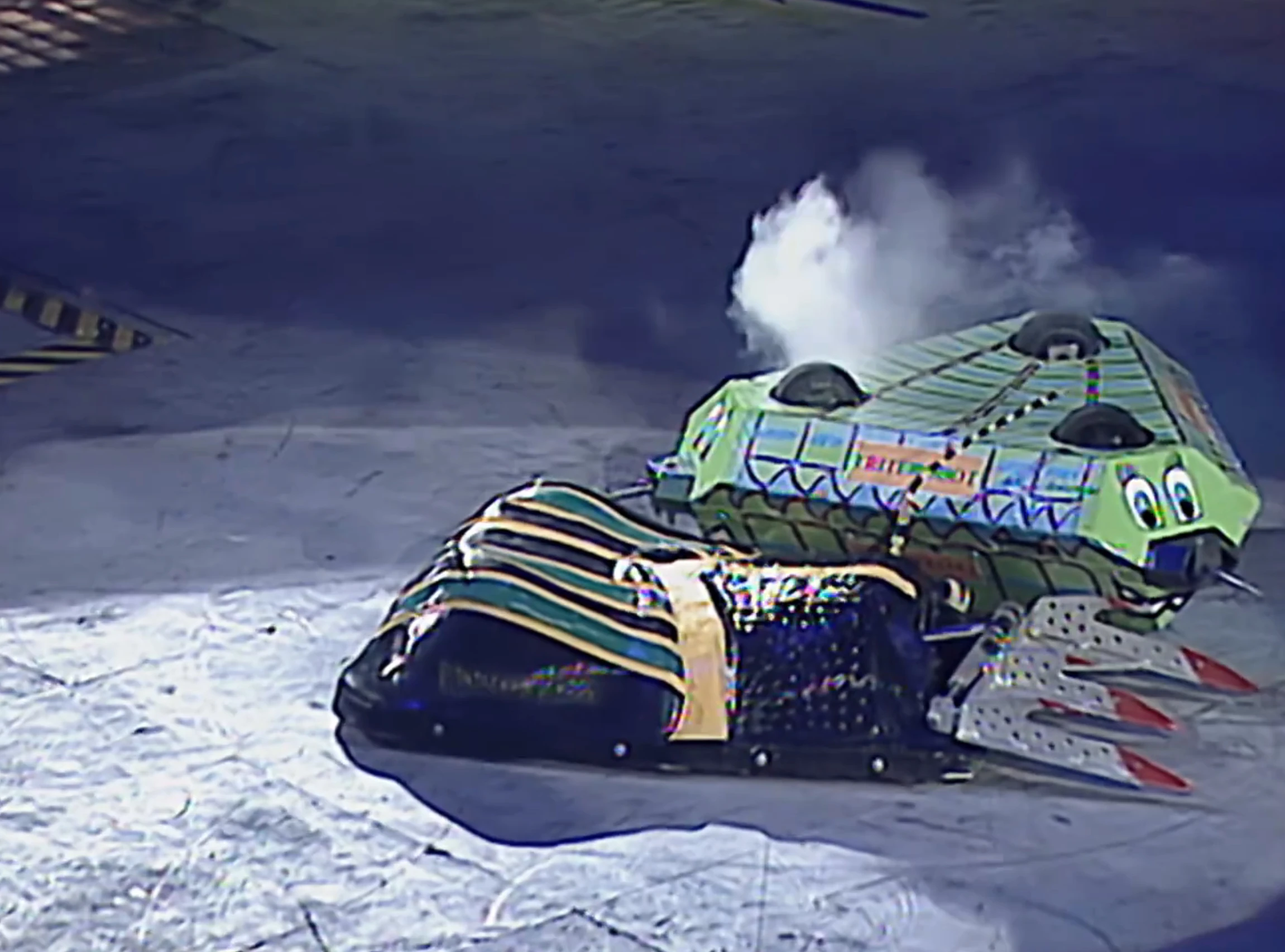 Dead Metal gripped onto Evil Weevil and cut into it with his saw, whilst Sgt. Bash blasted it with his flamethrower a couple of times, then grabbed it with his front jaw, pulling it away from the arena wall, to the arena centre, where he gave it another flick of flame.