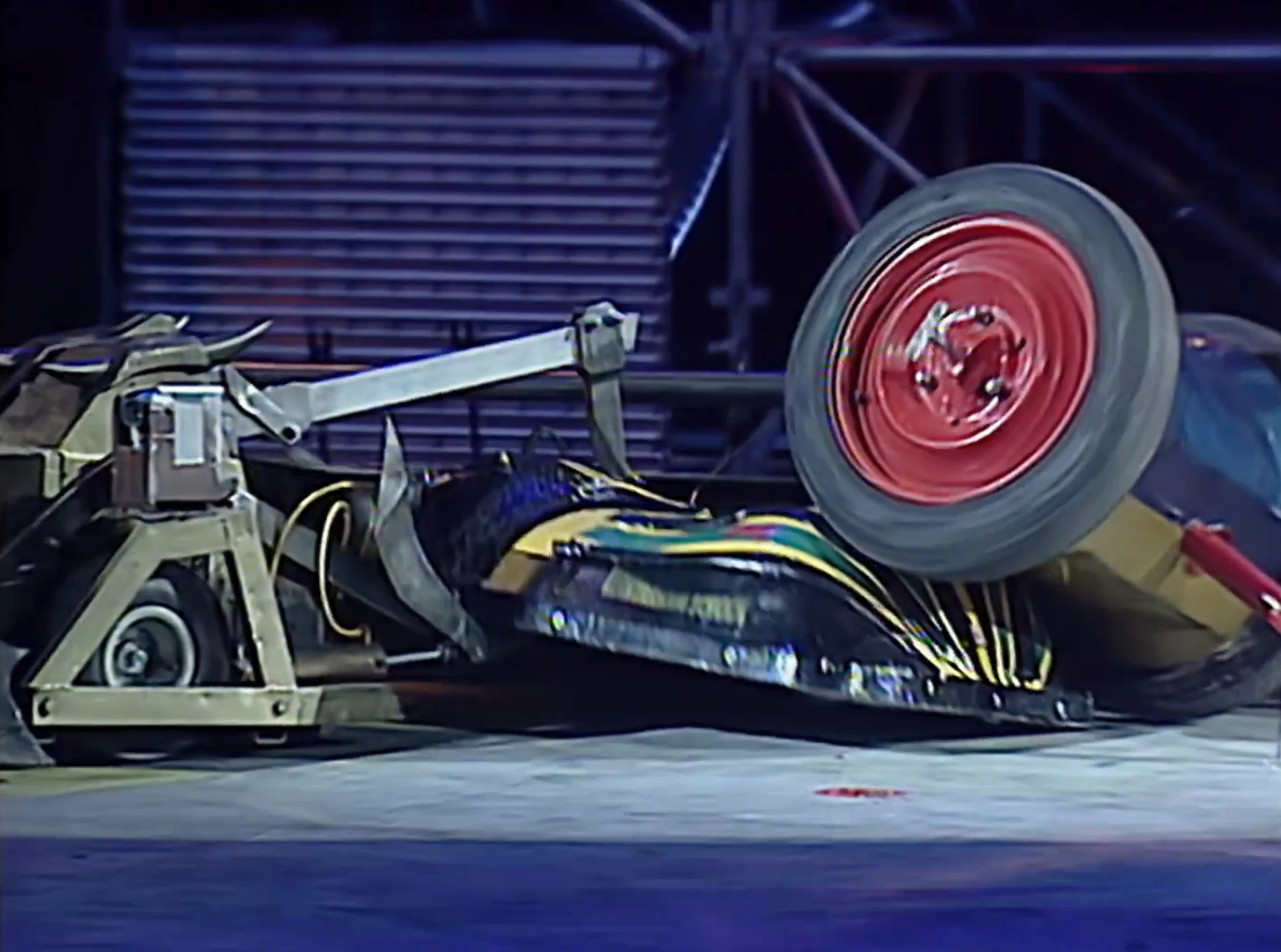 In the first qualifier, Evil Weevil locked forks against those of Panic Attack at one point, taking the chance to use its claw against the Series 2 champions. Eventually, it was turned over by Panic Attack and counted out after being unable to self-right. However, according to the South Wales Argus, both would unite to defeat the House Robots in a subsequent exhibition battle.[3] In the second head-to-head, Evil Weevil was outmanoeuvred by its red and yellow opponent, which lifted Evil Weevil for a few seconds using its smaller front lifting arm.[1]