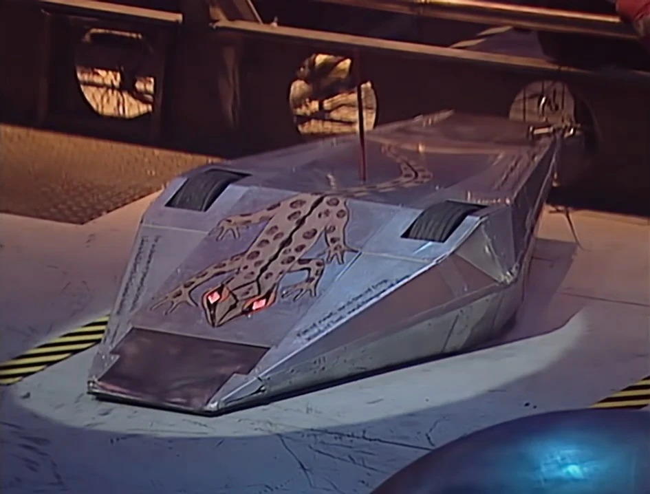 Originally, Eye of Newt was designed as a two-wheeled robot with a single wedge, painted grey and intended to be invertible. The version that appeared in Series 3 was a double-wedged robot, again invertible and with two-wheel drive. The wedges were designed in such a way that one could get underneath opponents and the other could act as a weapon when the robot spun, and vice versa when it was flipped. Eye of Newt was painted silver with a large picture of a newt printed on its top.