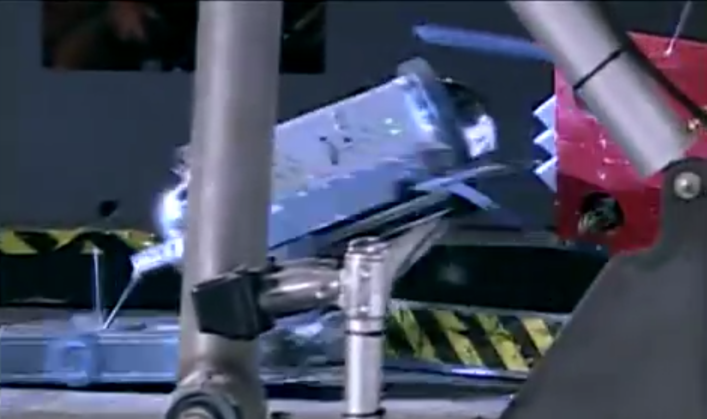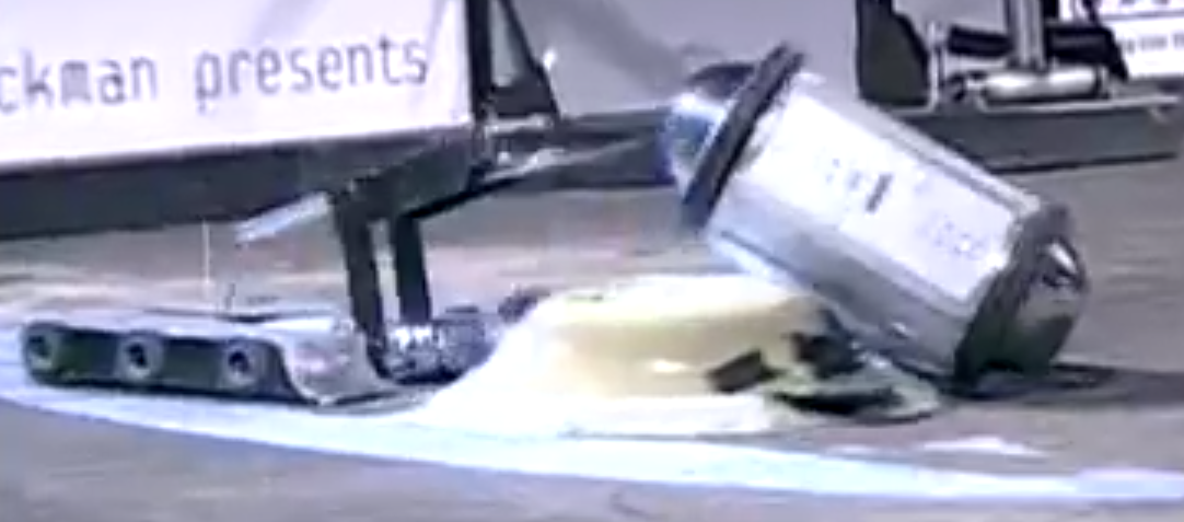 A spurt of movement allowed Finagler to break free, though Cooks again pressured and pushed it against the spike trap. Jack Buffington's machine was unable to escape from the pocket. Cooks, meanwhile, brushed against one of the arena flippers, and accidentally veered under the trap itself while trying to ram Finagler again. This resulted in the trap denting the shell of Paul Bell's robot, before it retreated and lunged at Finagler. Cooks bumped into its partially-immobile opponent, but wedged itself under the plywood 'curb'.[1][2]