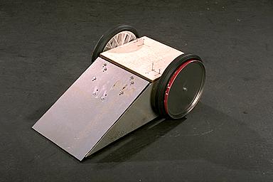Captained by Jesse Escobedo, Flipper was an invertible, two-wheel drive robot with large pneumatic tires and a basic wedge-shaped design. Its main weapon was a pneumatic rear-hinged lifting panel integrated into the upper wedge shape, which was unusual in being powered by airbush propellant. The propellant only provided Flipper with a low pressure, contributing to the weapon itself not being very powerful in combat. Two power window motors from a car provided drive for Flipper's exposed, rear-mounted wheels.[2] Flipper was armored in both metal and wood in some areas.