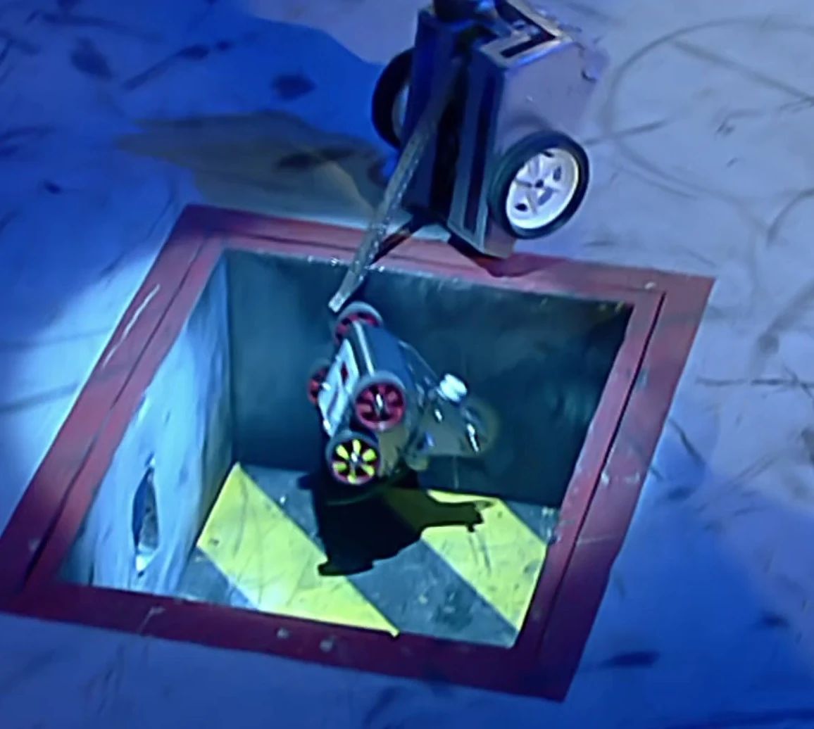 At the start, Flybot pushed Dragon away, before lifting Kitty up onto all four wheels. Kitty drove back down onto two wheels, before Flybot pressured it towards the pit, hooking its lifting arm under Kitty's wheel and flipping it in. However, this also caused Flybot to lose balance and throw itself head-over-heels into the pit as well.