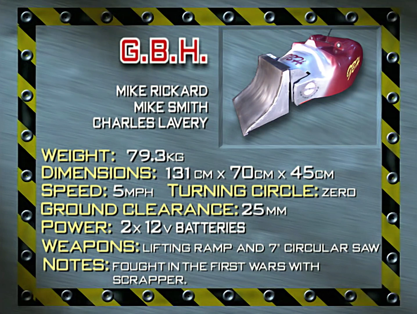 - "G.B.H was built using Scrappers chassis. New gearboxes were added to give a final drive ratio of 44:1. This drove two alloy go-cart racing wheels booted with some slick Bridgestone rubber. Its main weapon was a lifting ramp powered by pneumatics, this could lift 100 Kg. At rear two 7" & two 9" saw blades were mounted spinning at 6000rpm. The sexy body was constructed out of 1.6mm perforated steel with several layers of glass fibre."