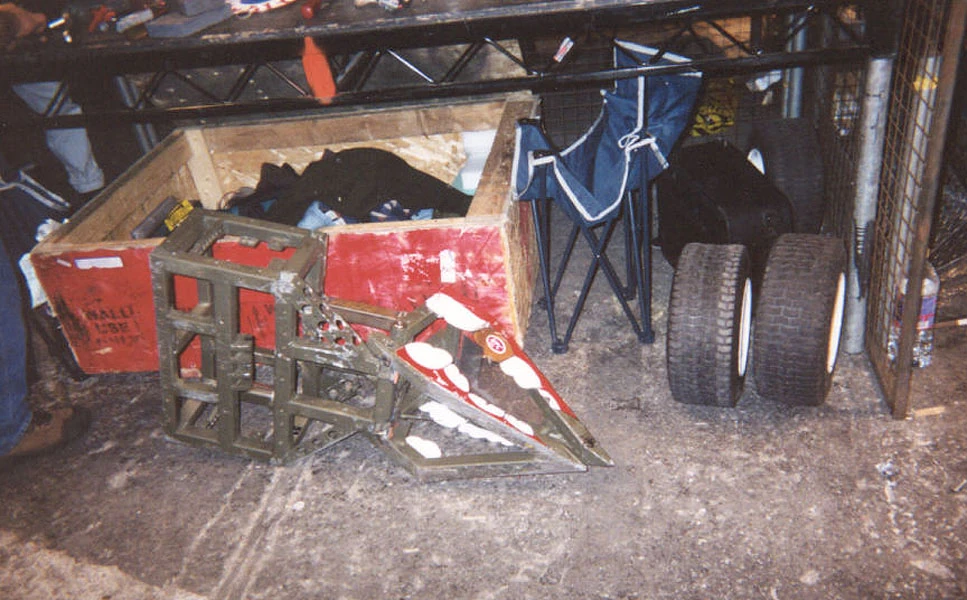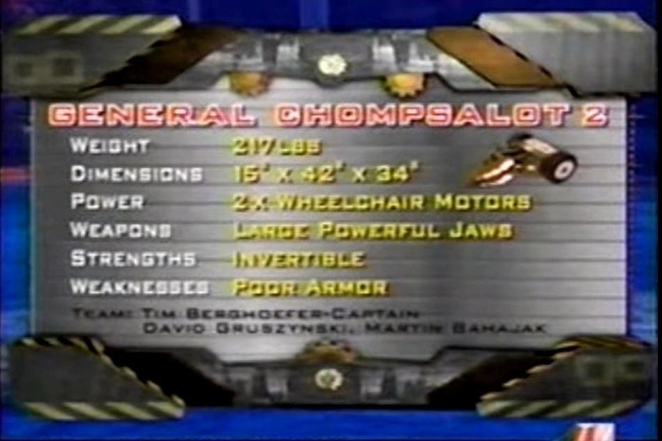 General Chompsalot 2 was larger, and featured a different body-shape with a longer, narrower jaw. This jaw was powered, having 3000 pounds of force, and had a very different shape, so that it could run along the ground and form a wedge when closed, allowing it to act as a lifter as well.