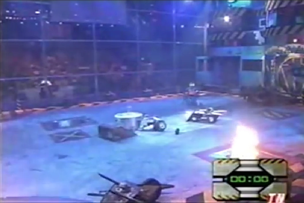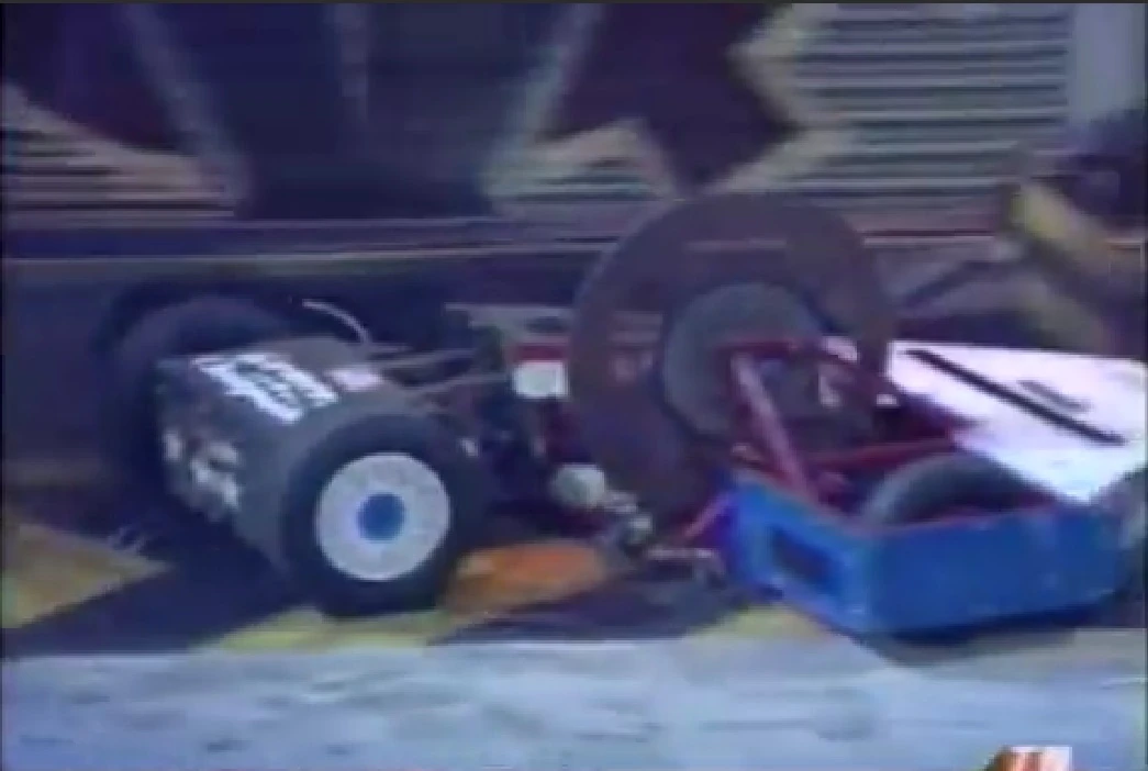 However, General Chompsalot 2 soon got its wheel back on the ground and rammed Manta into the bottom arena wall. General Chompsalot 2 let Manta go, but Manta was too slow to get away and General Chompsalot 2 rammed it, its tongue falling out as it did so. Manta had stopped moving, and General Chompsalot 2 pushed it into the Pit release button.