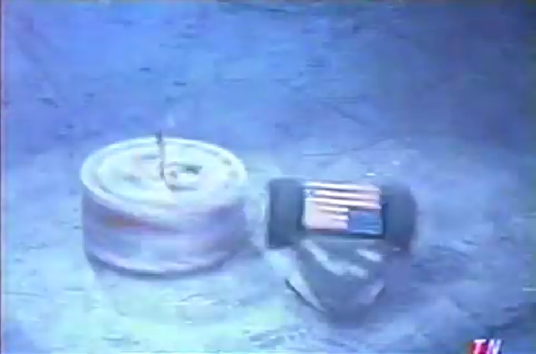 The eyes, which were made from foam Frisbees on the original robot, were replaced with flat panels. This version was powered by two NPC 74038 gearmotors, coupled directly to two 15" foam filled tires. These exposed wheels provided good speed and traction, but were easy targets for spinners.