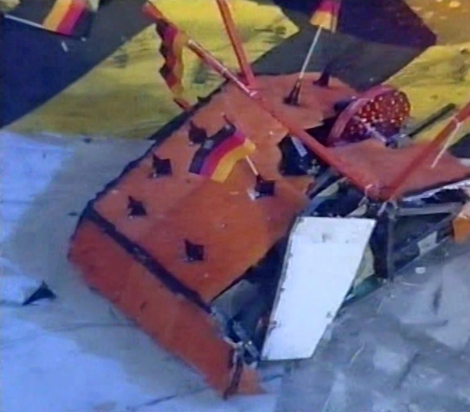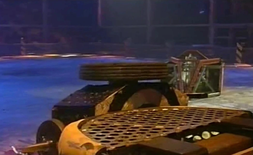 The two robots met in the centre of the arena, but Son of Armageddon quickly pushed Junkyard Queen towards the arena wall, leaving it over a flame jet. Son of Armageddon then lifted Junkyard Queen onto its side, where it remained propped due to the size of its wheels, and one of its lifting forks was stuck between the wall, and the Disc of Doom button. Son of Armageddon then slammed into Junkyard Queen a couple of times, before leaving Refbot to count Junkyard Queen out.