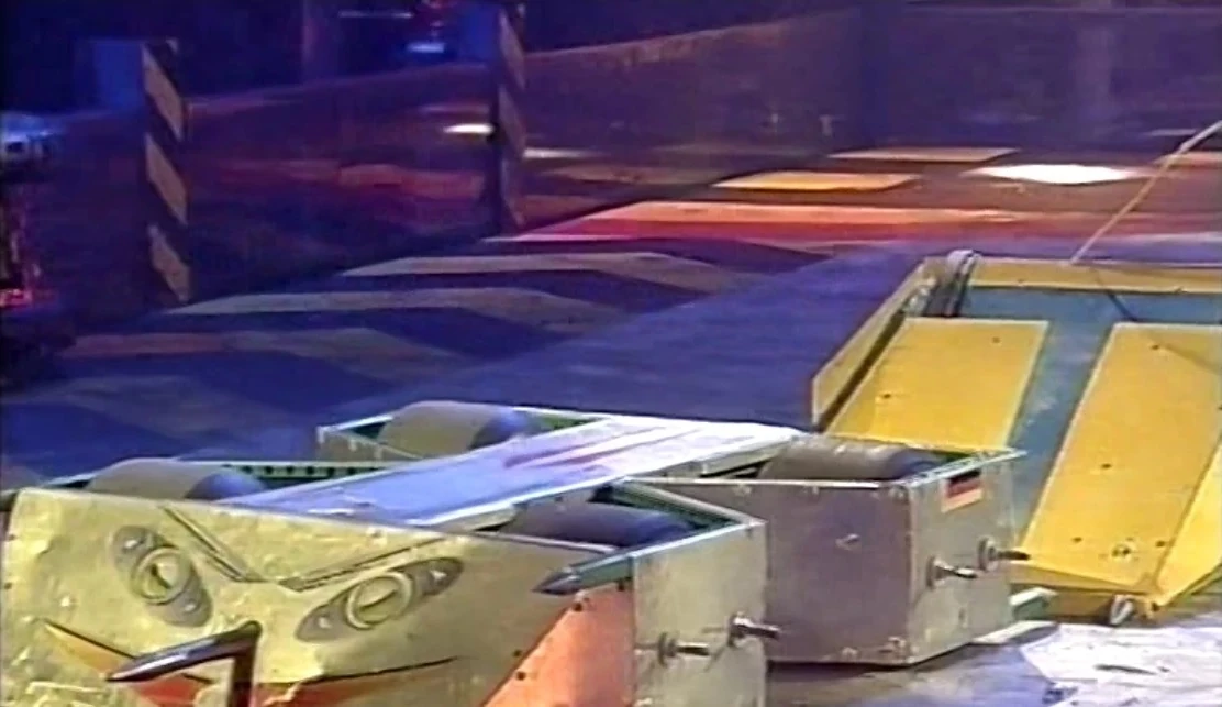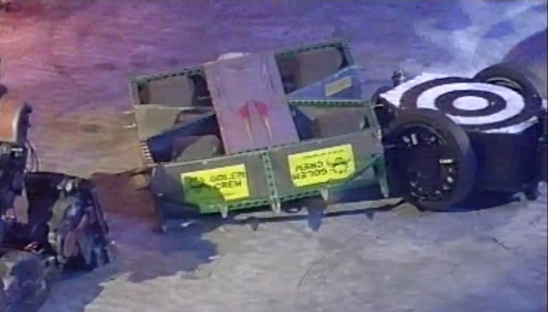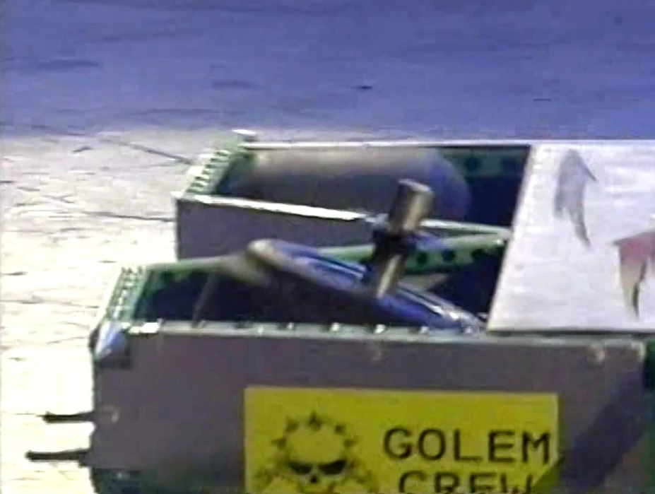Golem immediately charged at Tyke, but missed, running instead into Shunt, who axed the top of the robot. Golem did eventually manage to catch Tyke, pushing the yellow machine into the Pit release button. Tyke retaliated, pushing Golem towards the House Robots, but Golem escaped, spinning away. Despite this, Golem then broke down, and was promptly counted out by the Refbot.