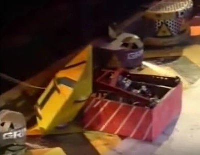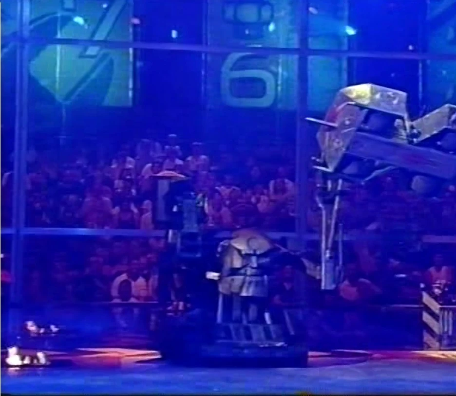 Sir Killalot then pounced, lifting Junkyard Queen up, almost ripping the Disc of Doom release off the wall, and placing it in the path of Matilda’s flywheel, puncturing one of the tyres. Killalot then placed Junkyard Queen on the Drop Zone, where a collection of spare parts was dropped on it. Junkyard Queen was then placed on the Pit, and after Matilda attacked the other tyre, Sir Killalot pressed the release button, eliminating Junkyard Queen from the competition.