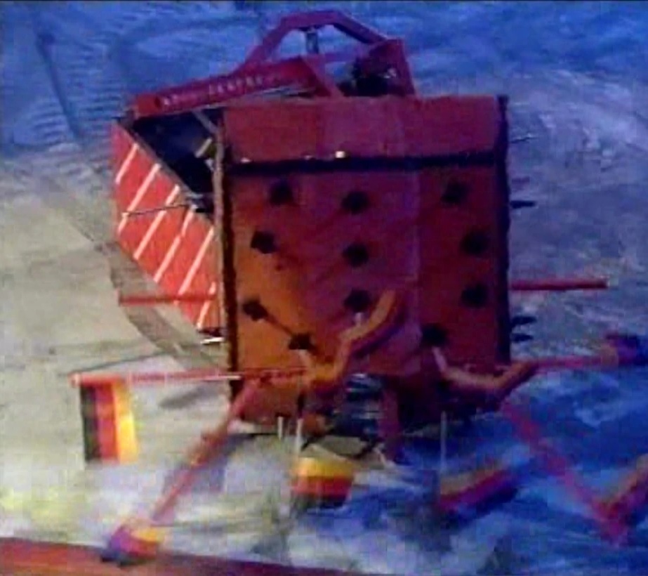 Smoke could be seen escaping from Golem as the House Robots pounced, Shunt and Mr. Psycho both attacking the defeated robot. Golem was pushed onto the Floor Flipper and thrown across the arena. Mr. Psycho then picked up Golem, dropping it on the other side of the arena. The punishment continued as Golem was pushed onto the Drop Zone and a collection of balls of varying sizes was dropped onto Golem. Mr. Psycho then pushed Golem into the Pit, and 'cease' was called.