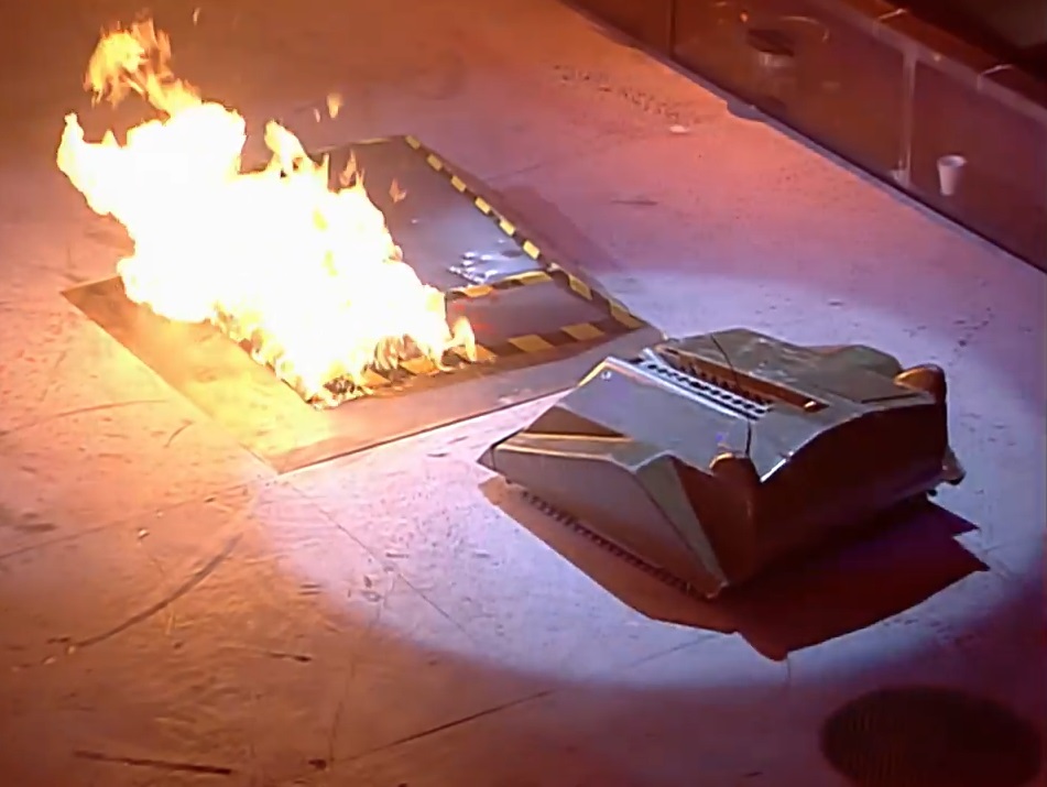 Ghetto-bot roasts on the Flame Pit after being shoved onto it by Mortis