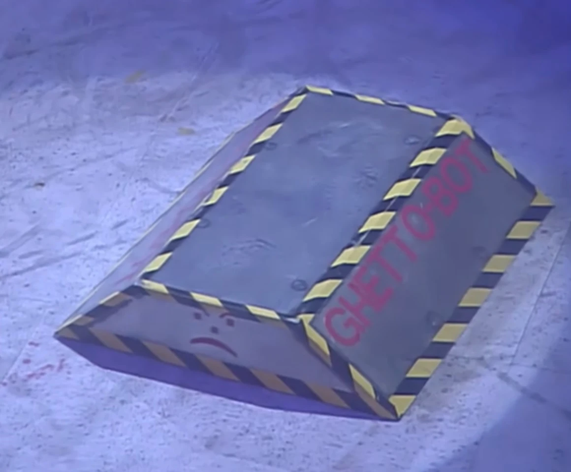 Ghetto-bot was a robot with a box-shaped chassis and a body featuring steep wedges at either end. The wedges served as its only weapons, with the intention of getting underneath opponents and tipping them over. The robot itself was painted silver with yellow and black hazard stripes, with its name written in red letters on the wedges and a pair of angry faces drawn on either side in red. While Ghetto-bot's low ground clearance and wedges proved effective, its lack of durability, pushing power and effective weapons proved costly in its only battle.
