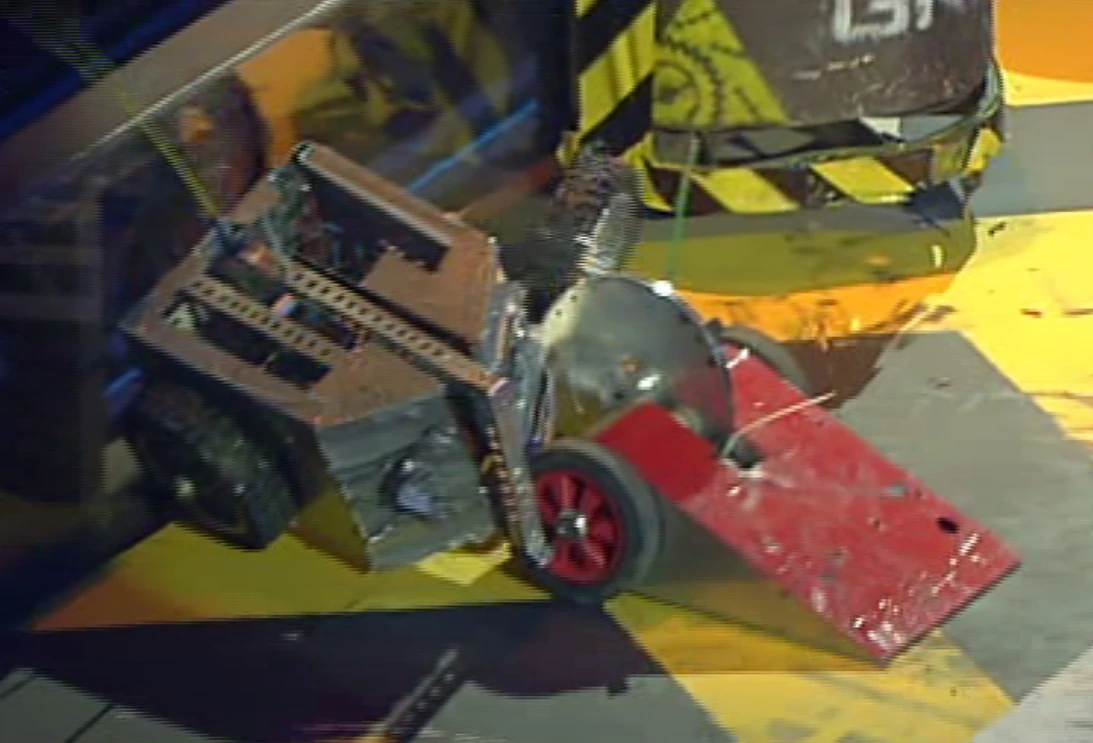 By this point, it became clear that Gladiator's right wheel had seized up, and it could only drive in circles, leaving it vulnerable to Argh! who, having immobilised Bernard and Cutlet, then used its wedge to drive underneath Gladiator, and this push appeared to fully immobilise Team BlazerBotics' machine. Unable to defend itself, Gladiator took damage to its front armour from numerous attacks from Argh!, before Argh!'s final attack tore Gladiator's wheel off.