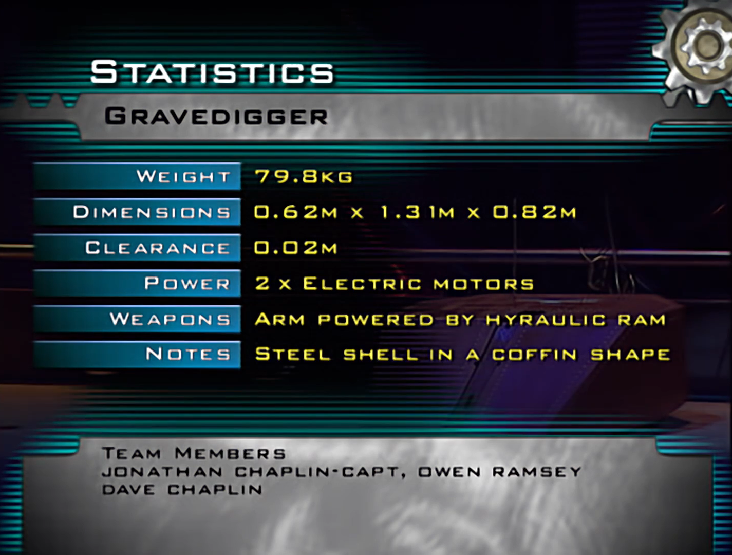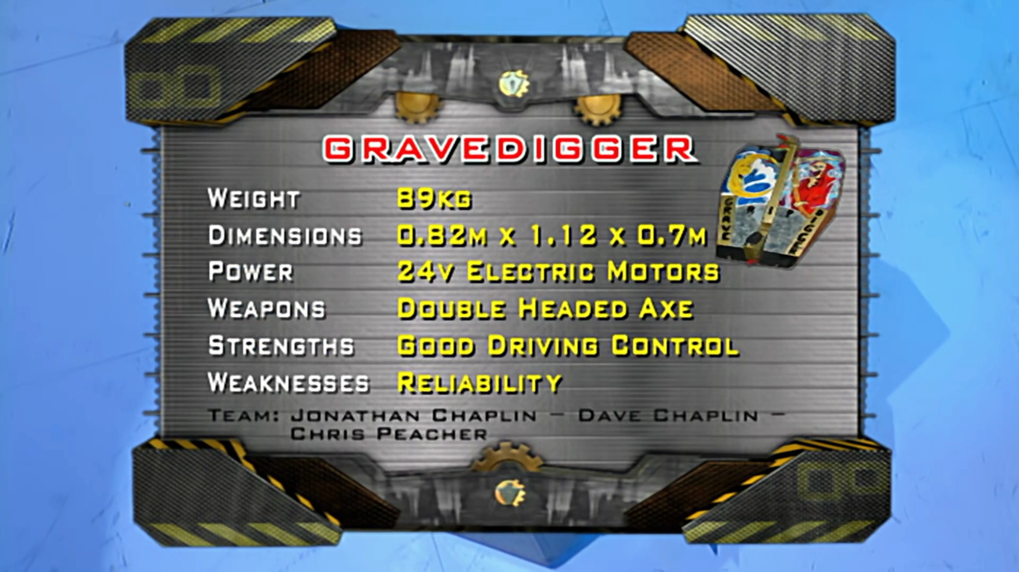 Gravedigger was entered into Robot Wars by a Norwich-based team. Jonathan Chaplin was the team captain and the main driver of Gravedigger and he was consistently joined by his father, Dave Chaplin.