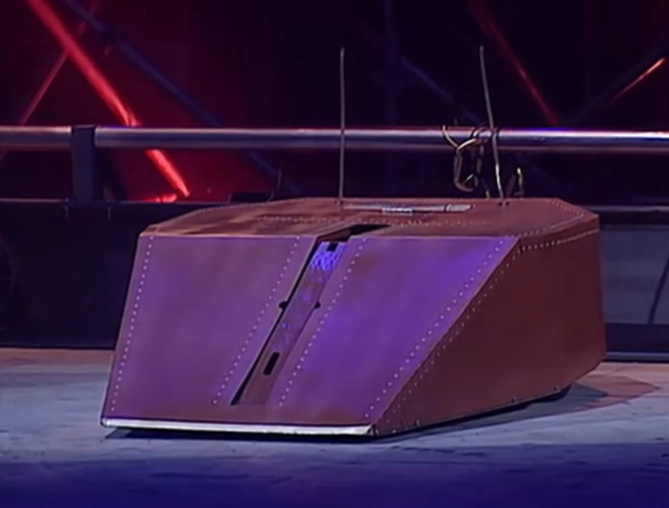 With a new axe weapon, Gravedigger had a tough draw in the first round of Heat G, as it was drawn up against the number 12 seed and fellow previous Semi-Finalist Tornado. Gravedigger charged at Tornado immediately, but missed its hit with its axe by considerable distance, as Tornado darted around it. It fired the axe again as Tornado rammed into it from behind, unable to push it across the arena floor.