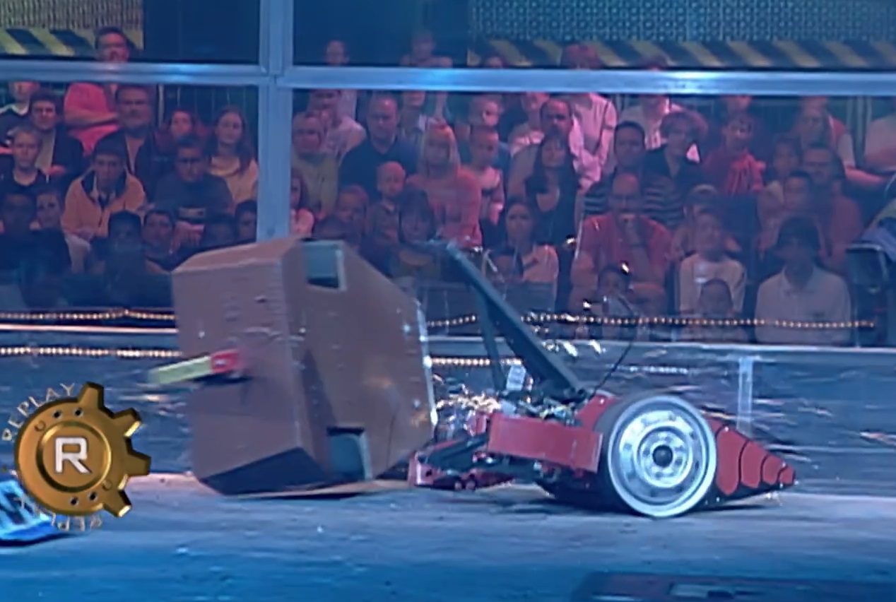It slammed into Kronic the Wedgehog again, over the Pit of Oblivion, and then slipped underneath Thermidor 2 easily, but it still could not fire its flipping arm. Gravedigger then became caught between Thermidor 2 and Kronic the Wedgehog when the latter was flipped up slightly, its front landing on Gravedigger's side. Spinning away, Gravedigger rammed into Kronic the Wedgehog yet again.