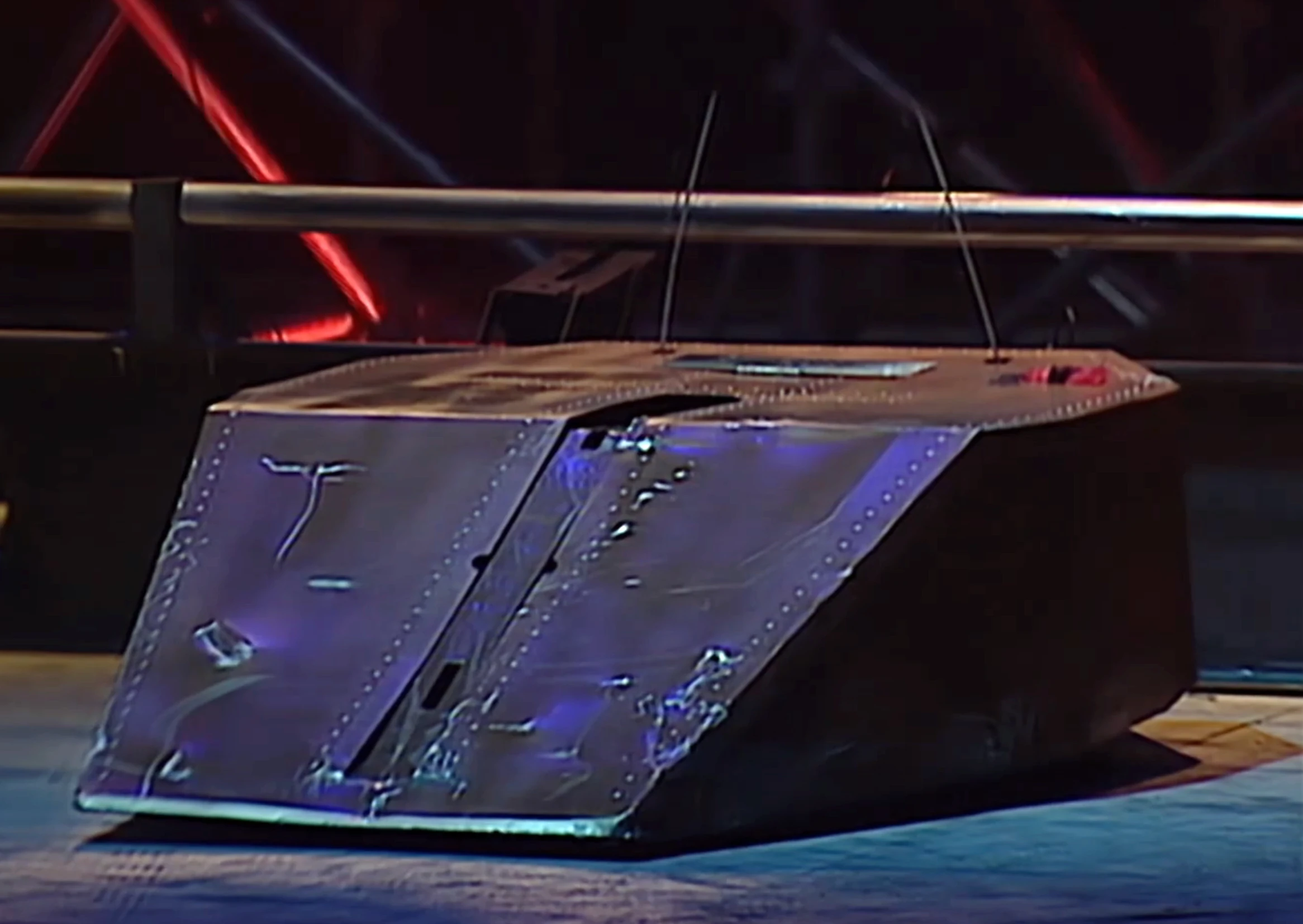 After failing to breach its opponent from the side, Gravedigger twisted round and pressured The Darke Destroyer towards the Flame Pit, sustaining scratches to the bodywork from the blades as it did so. Gravedigger then pushed The Darke Destroyer directly onto the Flame Pit, before Dead Metal attacked it. Gravedigger failed to breach The Darke Destroyer yet again, deflecting away to the side, allowing its opponent to catch one of its blades in the back of Gravedigger briefly. Gravedigger quickly retreated and charged, flicking its arm up as it made contact, but once again it failed to get underneath. Finally, Gravedigger got underneath The Darke Destroyer from behind and threw it across the arena, but it landed on its wheels.