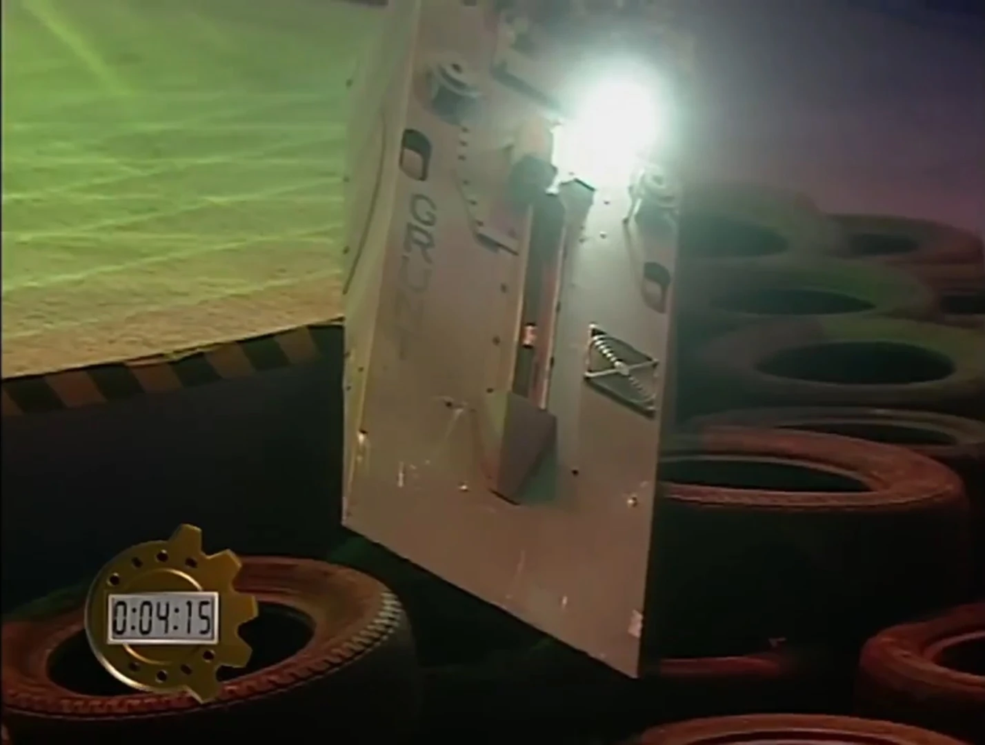 Clips from the event showed one half of Grunt fighting solo against The Mouse - the early incarnation of fellow Series 1 stock robot Eubank the Mouse - and two more competitors of similar size. Against The Mouse and the first featherweight machine, Dangerous Brians, the shallow wedge proved effective in getting underneath both opponents, allowing Grunt to control them effortlessly. The decorative left arm of Dangerous Brians was also knocked off following the collision in the second match. One set of clips from The First Great War focused on Grunt performing a high-speed spin under the arena spotlight, with a rabbit-themed robot laying stationary in the background. Similar spins would also be performed in its fight against The Mouse, as shown in Newsround footage.