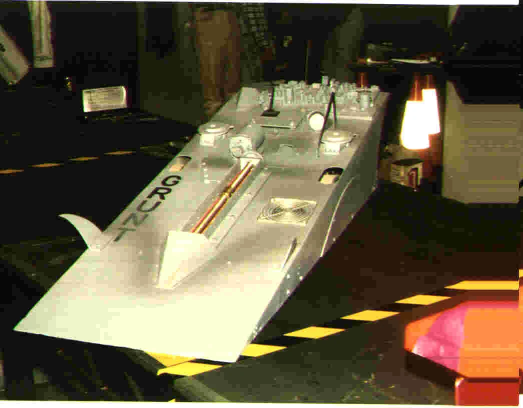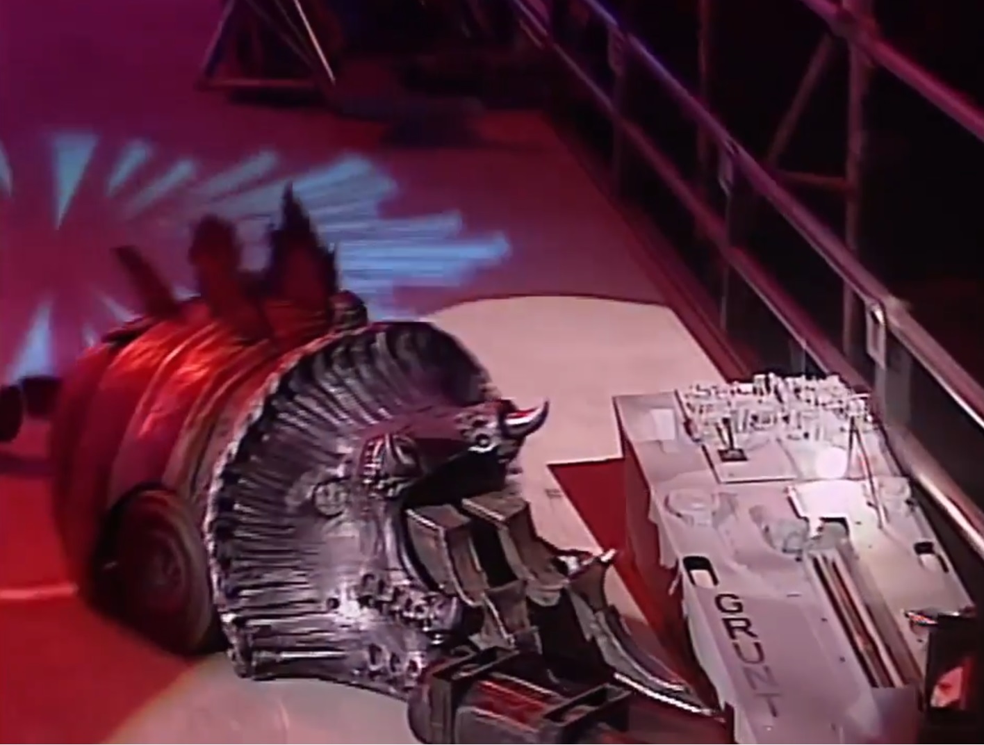 Each of the 1995 Grunt builds featured noticeable cosmetic differences over the Series 1 incarnation, along with a generally less detailed shell. One version incorporated twin exhaust pipes, vents, an air scoop and a smooth lower wedge surface with red, yellow and black detailing. Compared to the Series 1 iteration, the 'Grunt' name was also displayed at a larger size and with an alternative font. The second version, referred to as Sydney by Newsround presenter Chris Rogers,[1] incorporated a similar recessed cutout and extra side panels to the Series 1 incarnation. 'Sydney' was further distinguished by sets of three forward-facing red blades attached to either side of the cutout. Battle footage from the UK Open confirms that 'Sydney' had two large wheels in the centre, surrounded by four smaller castors.