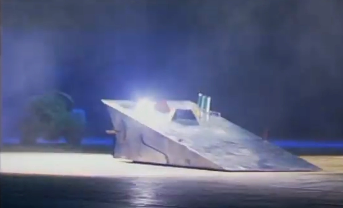 Grunt was a relatively long, thin wedge-shaped robot with an all-over grey paint scheme, designed to loosely resemble a battleship. In the absence of powered weapons, it relied on its shallow wedge shape to drive underneath and control opponents, as showcased in highlights of its 1995 UK Open run. Design details included a functioning lightbulb; an external fan on the front-left surface; removable bladed hooks; and a recessed rectangular-shaped cutout likely simulating an aircraft catapult. The robot's name was displayed vertically on the right-hand side of the front wedge shape.