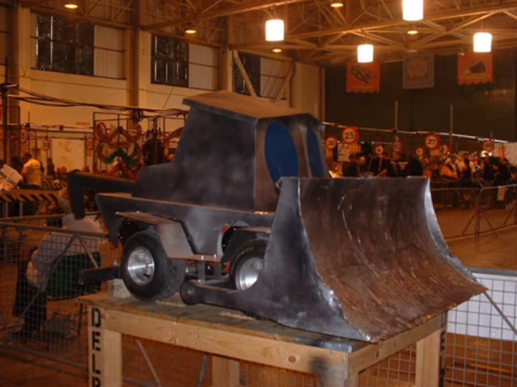 The concept of a House Robot dates back to the original 1994 US competition in San Francisco, where a machine under this name was used in the Escort and Melee events. Armed with a 180-degree lifter, the House Robot was used in the former to incapacitate an unnamed white drone, which competitors had to defend from the House Robot while it navigated across the arena. It also appeared in the multi-class Melee battle towards the end of the competition, sparring with various competitors.[2]