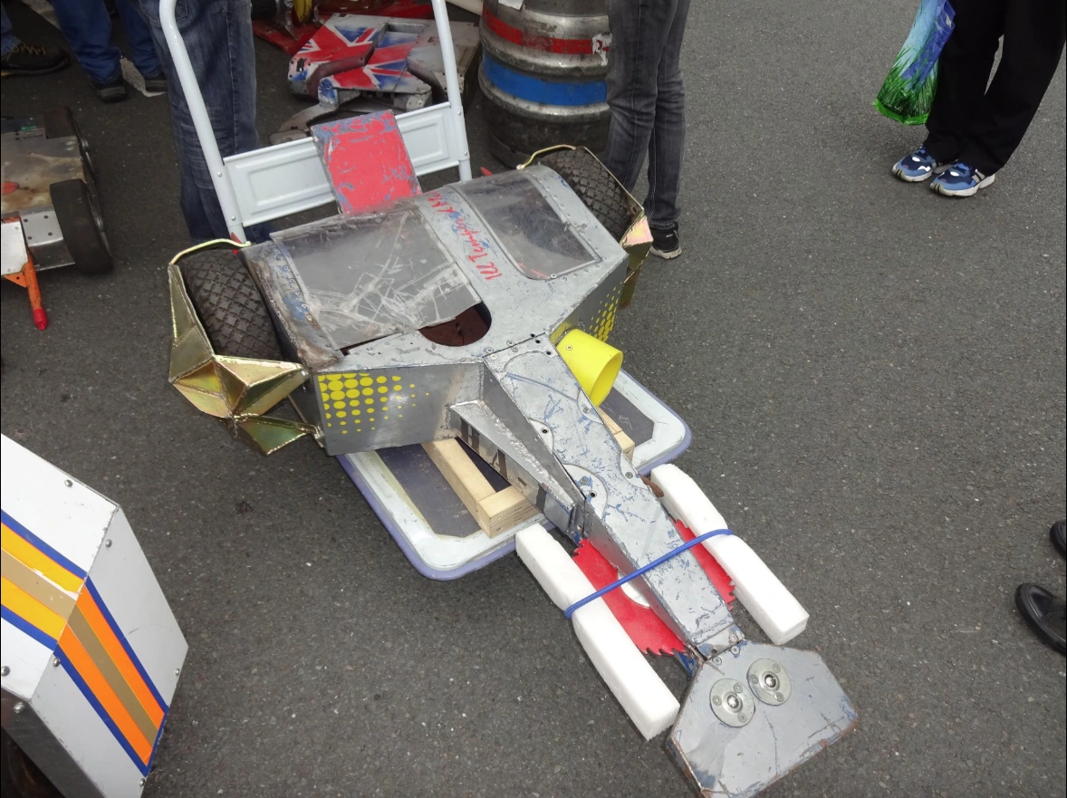 The Scrappers brought Ill-Tempered Mutt to RoboNerd in August 2019 alongside PC Plod. It took almost a year for Ill-Tempered Mutt to return to the arena, at the Extreme Robots event in Colchester, in September 2019. Competing for Team Eruption, Ill-Tempered Mutt got unlucky in the draw over the weekend, being placed twice against Thor. Ill-Tempered Mutt entered the arena upside down in both of these instances, in order to avoid a repeat of Maidstone 2018, however, Thor's axe dented the bottom panel enough to twist the drive gears, jamming a chain in both fights, leading to quick immobilisation in both fights.