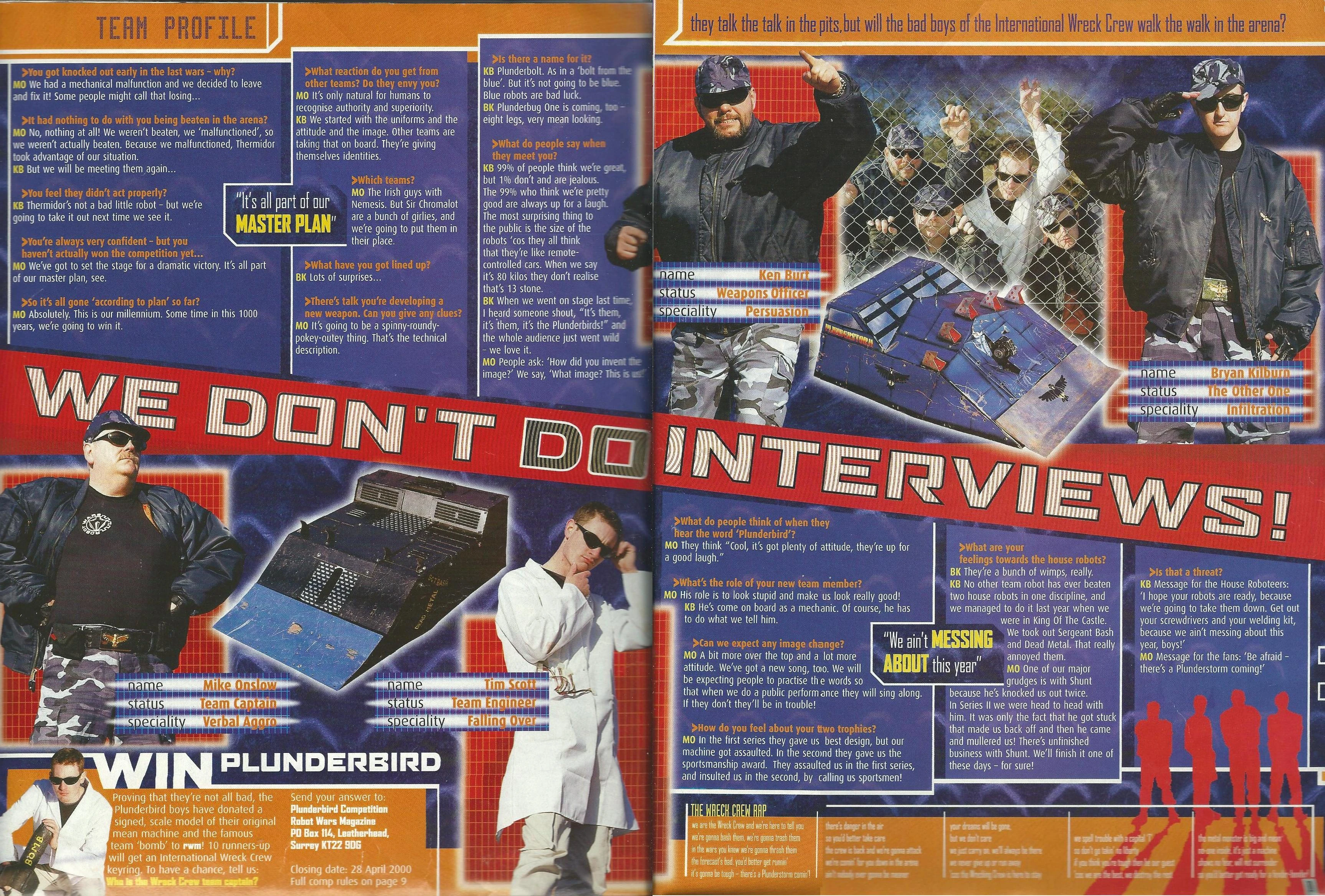 The International Wreck Crew were based in Alton, Hampshire, their team name being a pun on International Rescue, the rescue organisation in the television show Thunderbirds. They continued their references to the aforementioned TV show with the Plunderbird name of their robots playing off the show's name. The team were one of the most unique to appear on Robot Wars as unlike other teams, they often played characters on screen to provide entertainment and also dressed in their own style, rather than wearing just the regular team shirts. Their unique style and personality was applauded by many, including Chris Reynolds, who was very impressed by their approach to the competition.