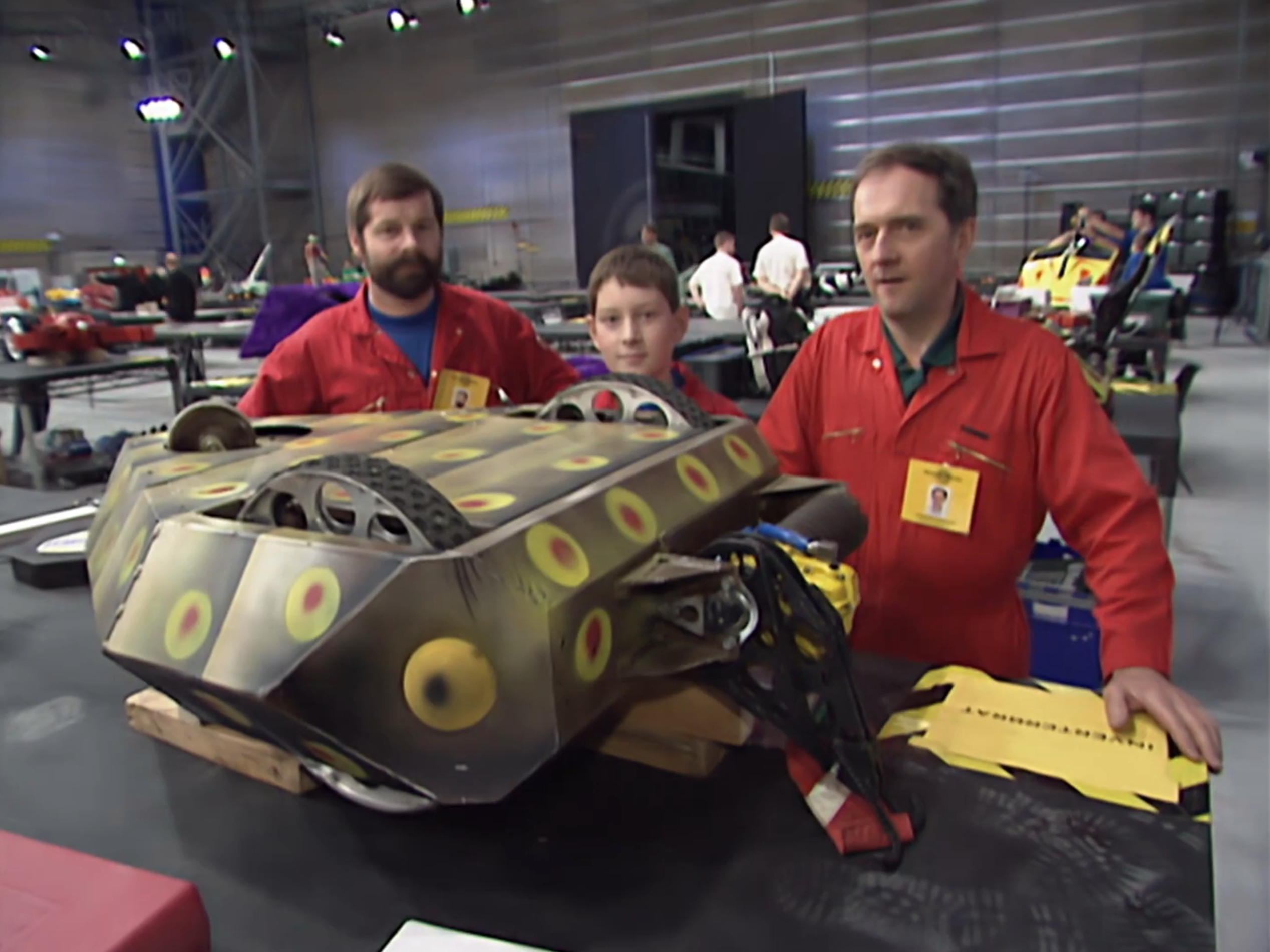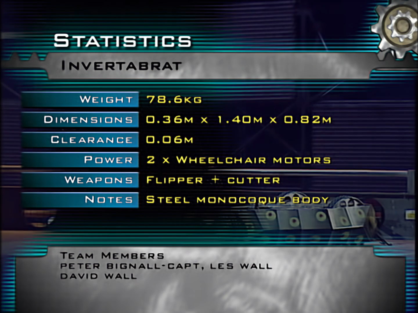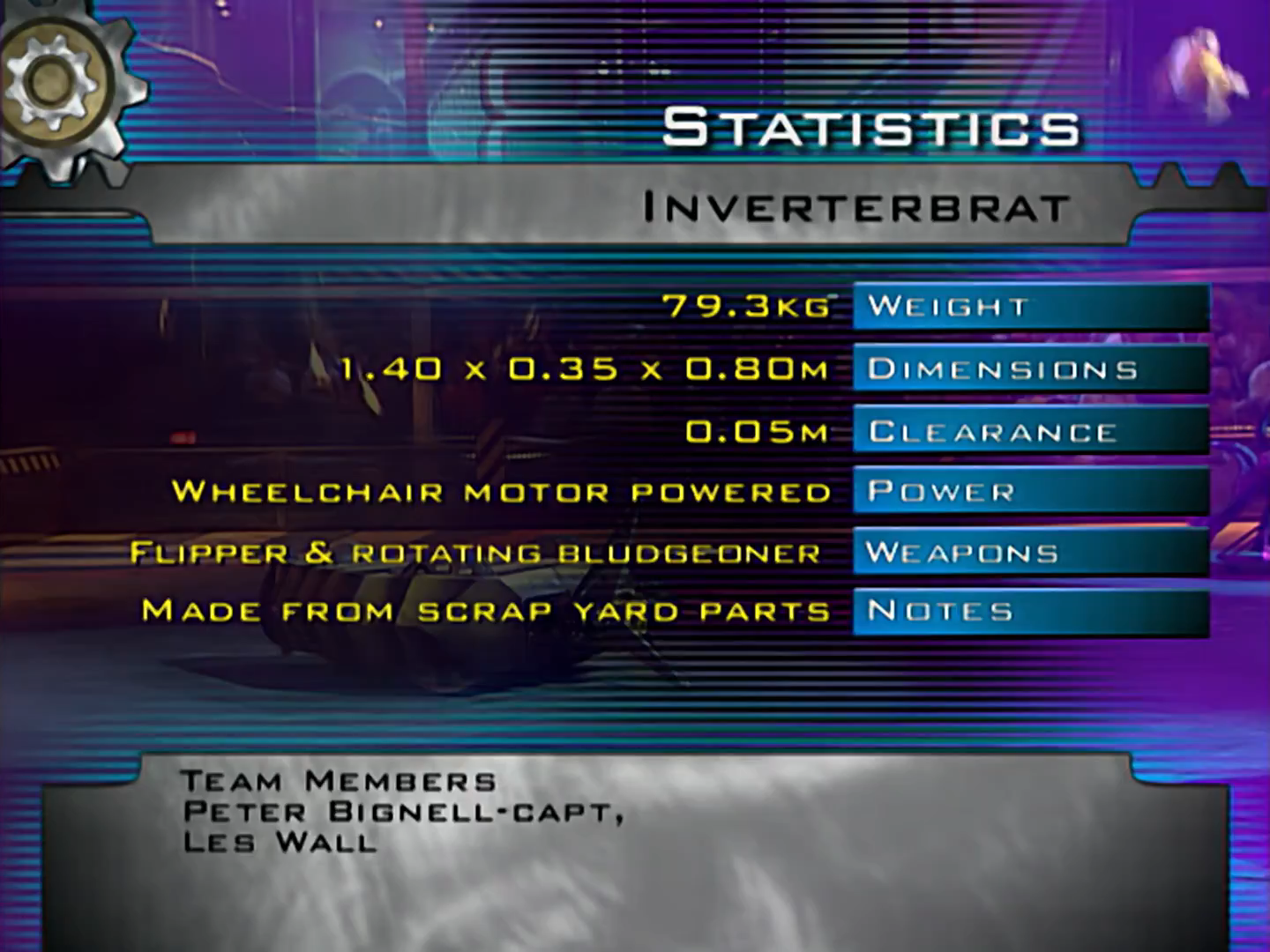 As its name suggested, Inverterbrat was completely invertible. Unusually, it was made entirely of recycled parts from scrap yards, including 2 24 volt wheelchair motors, running at 36 volts, and a steel monocoque body. It was powered by batteries and compressed air to lift in excess of 100 kg. It had a top speed of 10mph.[1] In Series 3, the robot was painted dark green with yellow spot patterns before it was repainted with a yellow and black striped scheme that made it resemble a bee or wasp for Series 4.