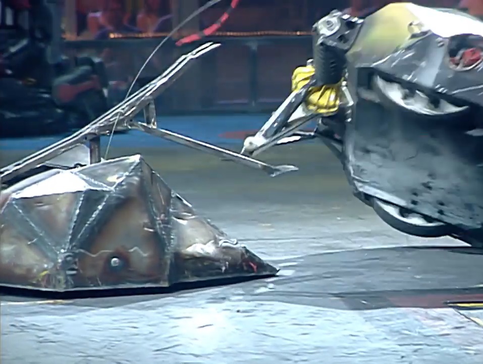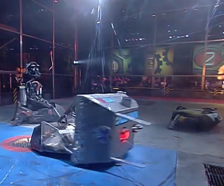 The two separated, with Invertabrat reversing for another attack, and Terrorpin turning to line up another charge. Terrorpin pushed Invertabrat onto the arena spikes, which blocked it from pushing Invertabrat any further, allowing Invertabrat to turn and reverse away. Terrorpin shoved Invertabrat again, attempting to impale it onto the arena spikes, but failed to do so. Terrorpin continued to chase after Invertabrat, who evaded its opponent with relative ease.