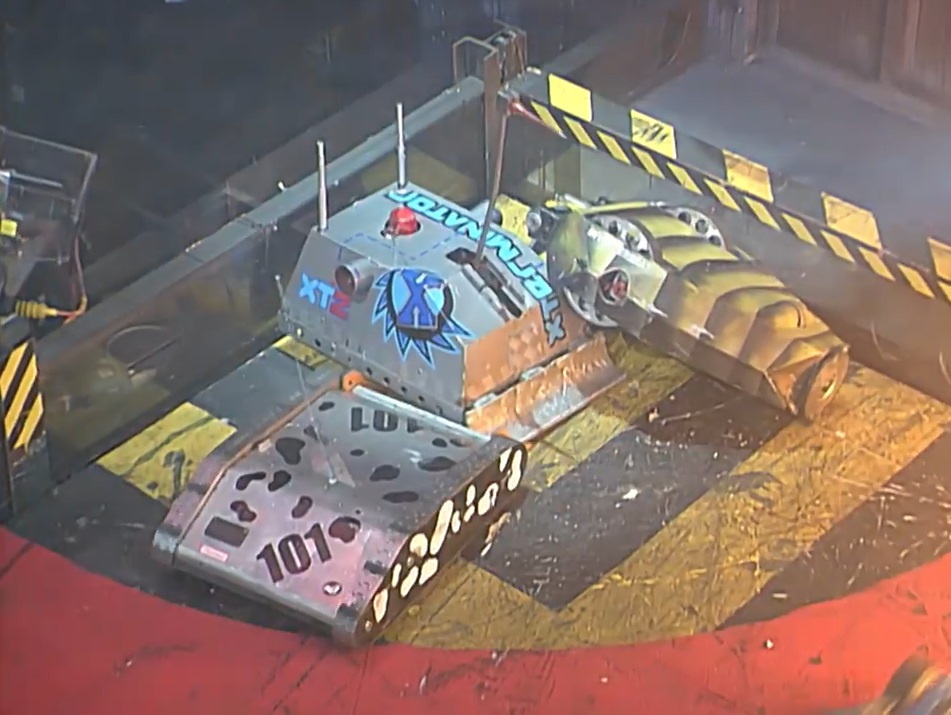 X-Terminator 2 went out first against Bigger Brother, but after Bigger Brother flipped it onto its side and held it up, Inverterbrat came out of its zone to help. However, X-Terminator 2 self-righted, and Inverterbrat went back, chased by Dead Metal, who was trying to enforce the rules. X-Terminator 2 tagged Inverterbrat not long after this, and Inverterbrat drove at Bigger Brother, which flipped it up and pushed it down the arena.